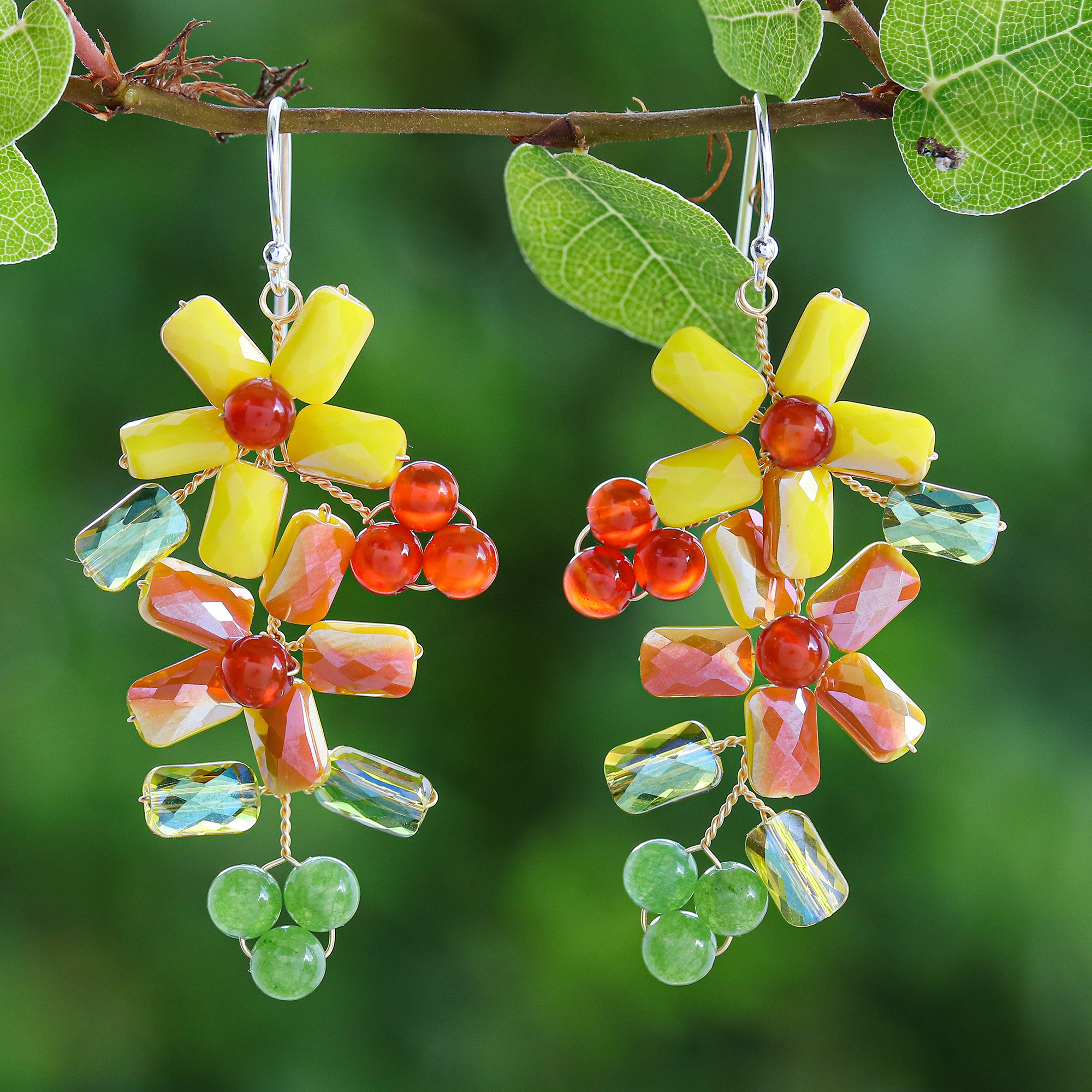 Radiant blooms flourish in the hands of artisan Nareerat of Thailand, starting a spring bathed by the sun's golden light. Known for her gorgeous creations, Nareerat crafts these dangle earrings from quartz and glass beads in a palette of yellow, orange and green hues. Brass wires unite each piece gently, allowing a beautiful illusion that dangles from sterling silver hooks.