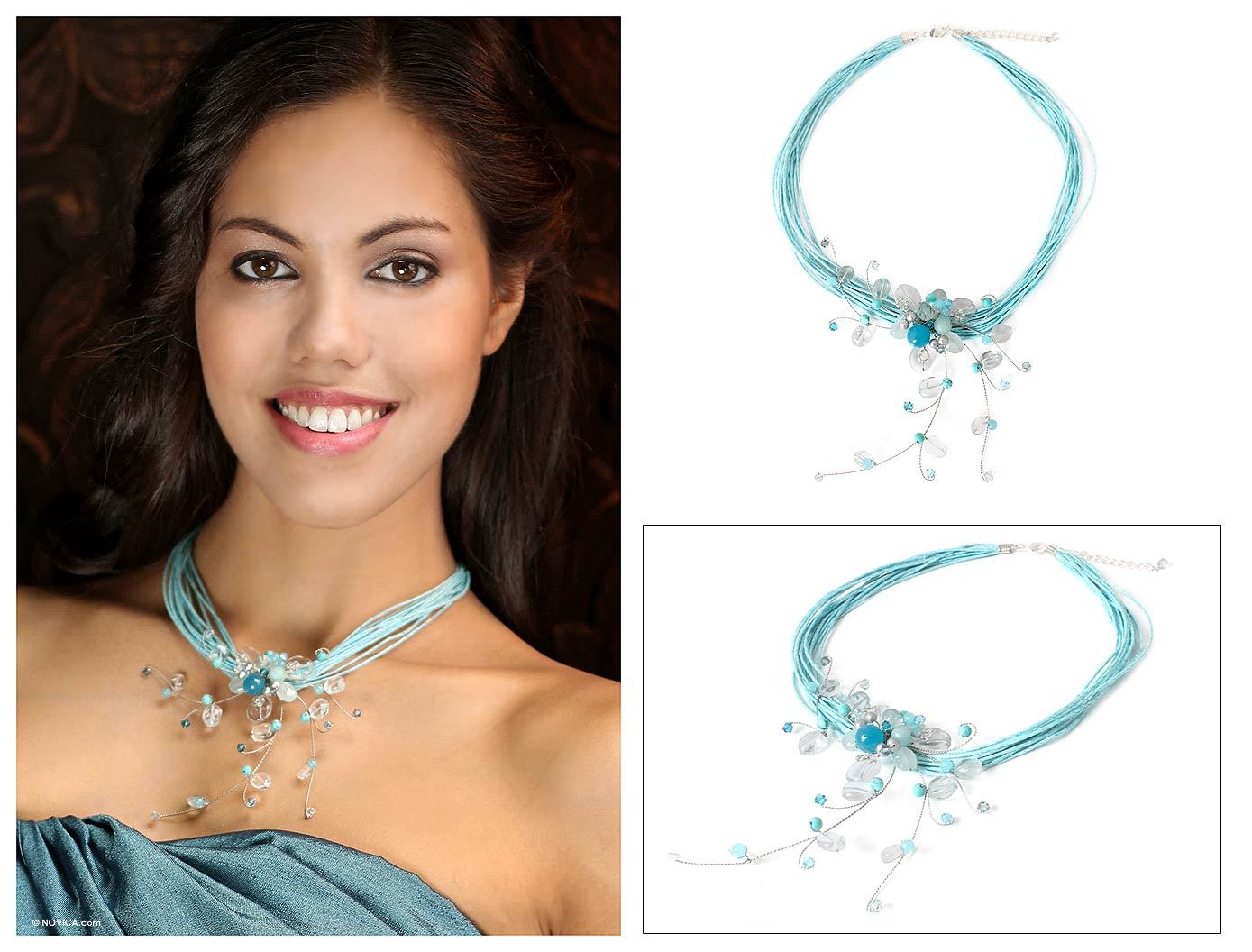 Tumbling in a joyous spray, quartz mingles with blue calcite and aquamarine. Colorful beads also pose on stainless steel strands as Busarin creates an exuberant floral arrangement. The delightful handcrafted choker is adjustable in length with a chain and clasp bathed in sterling silver.