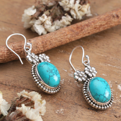 Floral Sterling Silver and Recon Turquoise Dangle Earrings, 'Bloom of the Island'