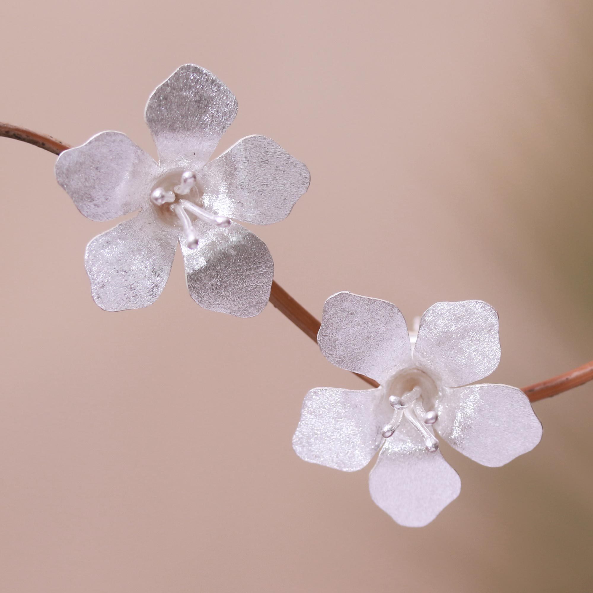 Captivating in their beauty, two flowers are crafted from sterling silver, their petals treated with a brushed-satin finish. Balinese artisan Desi Antari creates these fabulous button earrings.