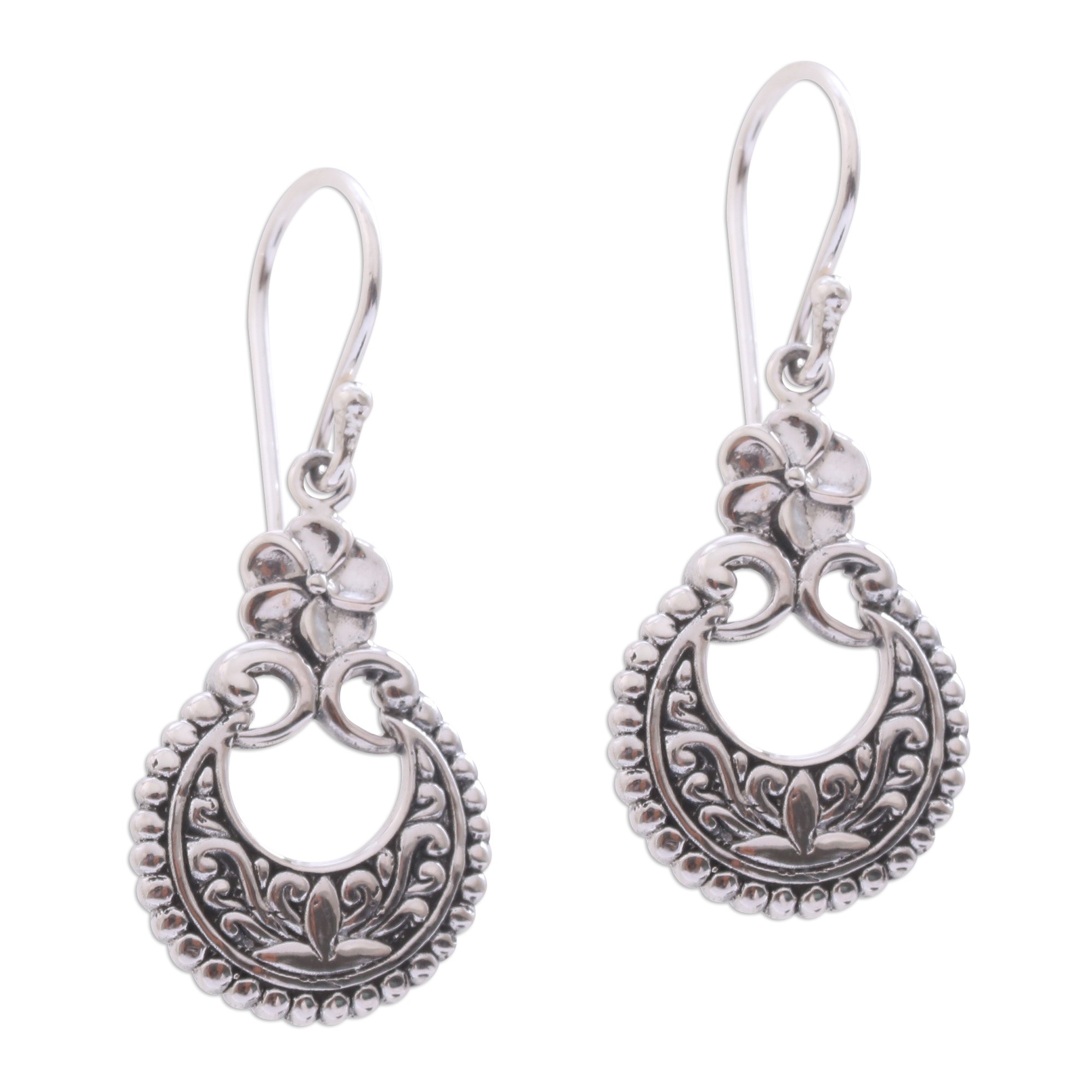Floral Sterling Silver Dangle Earrings Crafted in Bali, 'Frangipani Crescents'