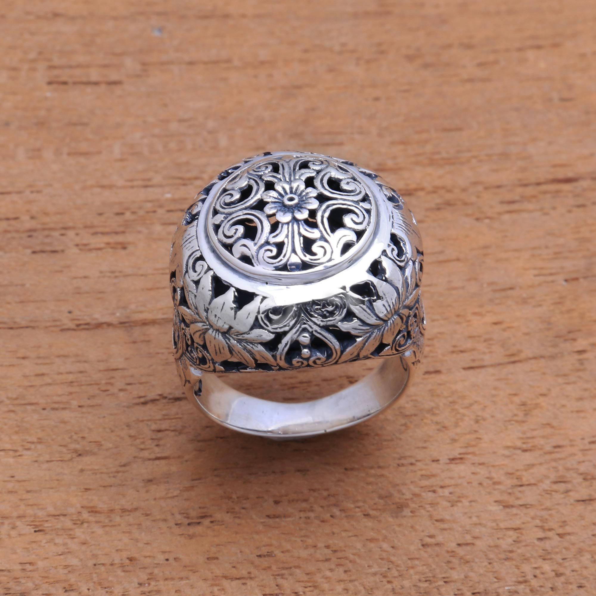 Revealing a darkly oxidized interior, gleaming floral openwork patterns are crafted in sterling silver. Balinese artisan Ni Wayan Astiti creates this lovely domed ring.