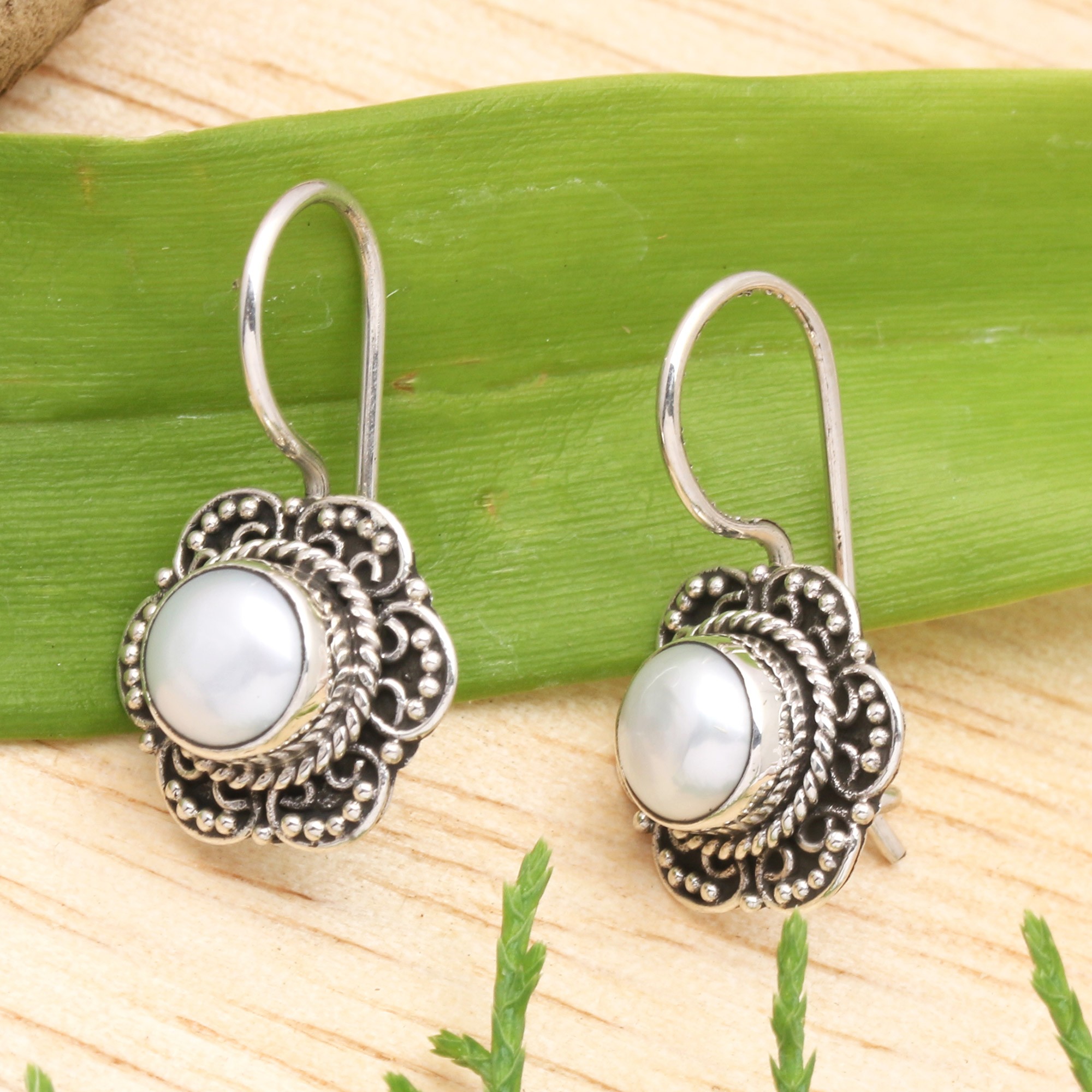 Flowers bloom and—as they open up—the most gorgeous cultured mabe pearls emerge. These celestial drop earrings are crafted from sterling silver, combining polished and oxidized finishes in a sublime design presented by Sukartini of the enchanting Balinese islands.