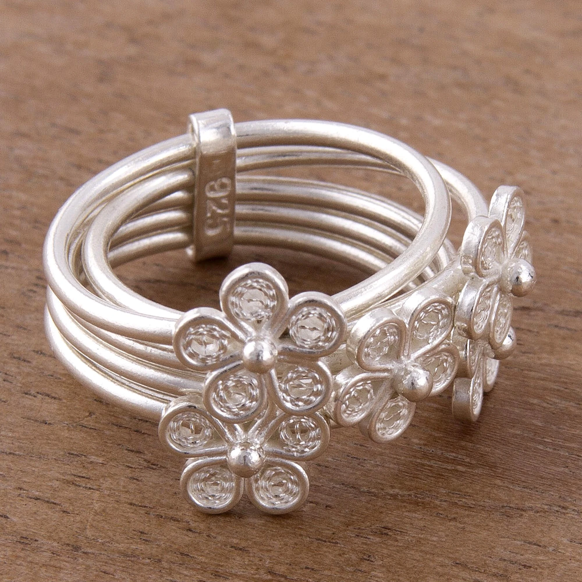 Five lovely flowers orbit the finger, handcrafted with intricate sterling silver filigree work. Designed by Peruvian artisan Paola Siza, this cocktail ring features five individual bands that are connected together.