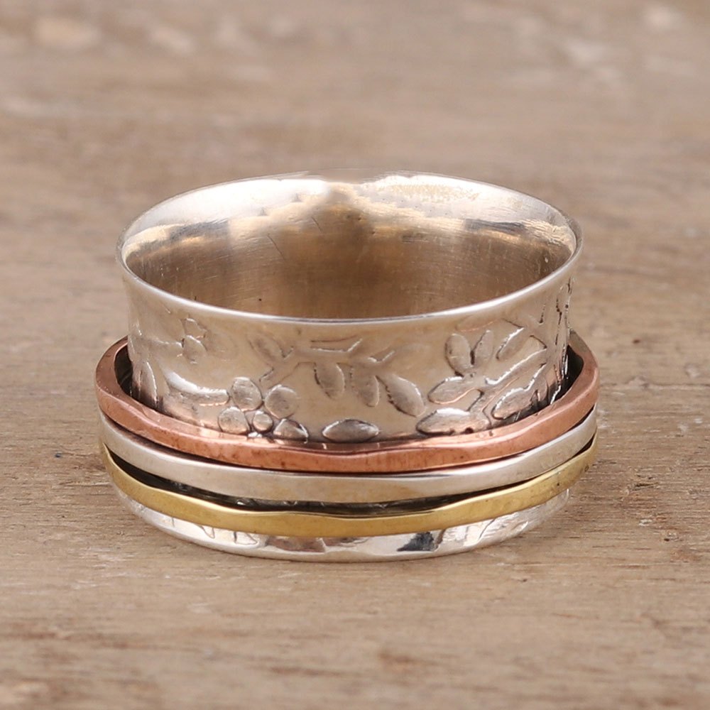 Featuring elegant floral motifs in relief, a bold band of sterling silver circles the finger. Indian artisan Neetu Barathi designs this ring, featuring spinning segments of sterling silver, copper, and brass.