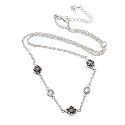Sparkling blue topaz gems punctuate this sterling silver station necklace like drops of clear sky caught between sculpted blossoms. The mix of polished and oxidized surfaces gives the design a textured rhythm—refined yet full of movement. With its balance of delicacy and detail, this chic accessory created by Balinese artisan Ekayani is made to be noticed.