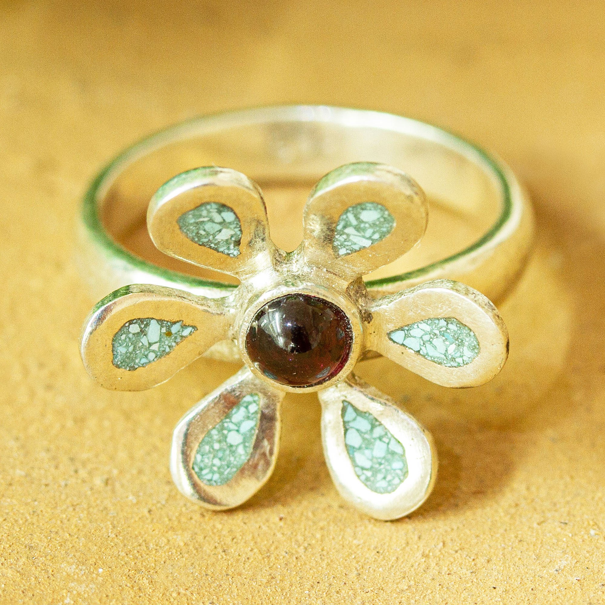 This pretty sterling silver flower ring is the original design of Mexico's Mariana Llanes. The petals of the flower are inlaid with cool reconstituted turquoise, and centered by a cabochon of natural garnet.