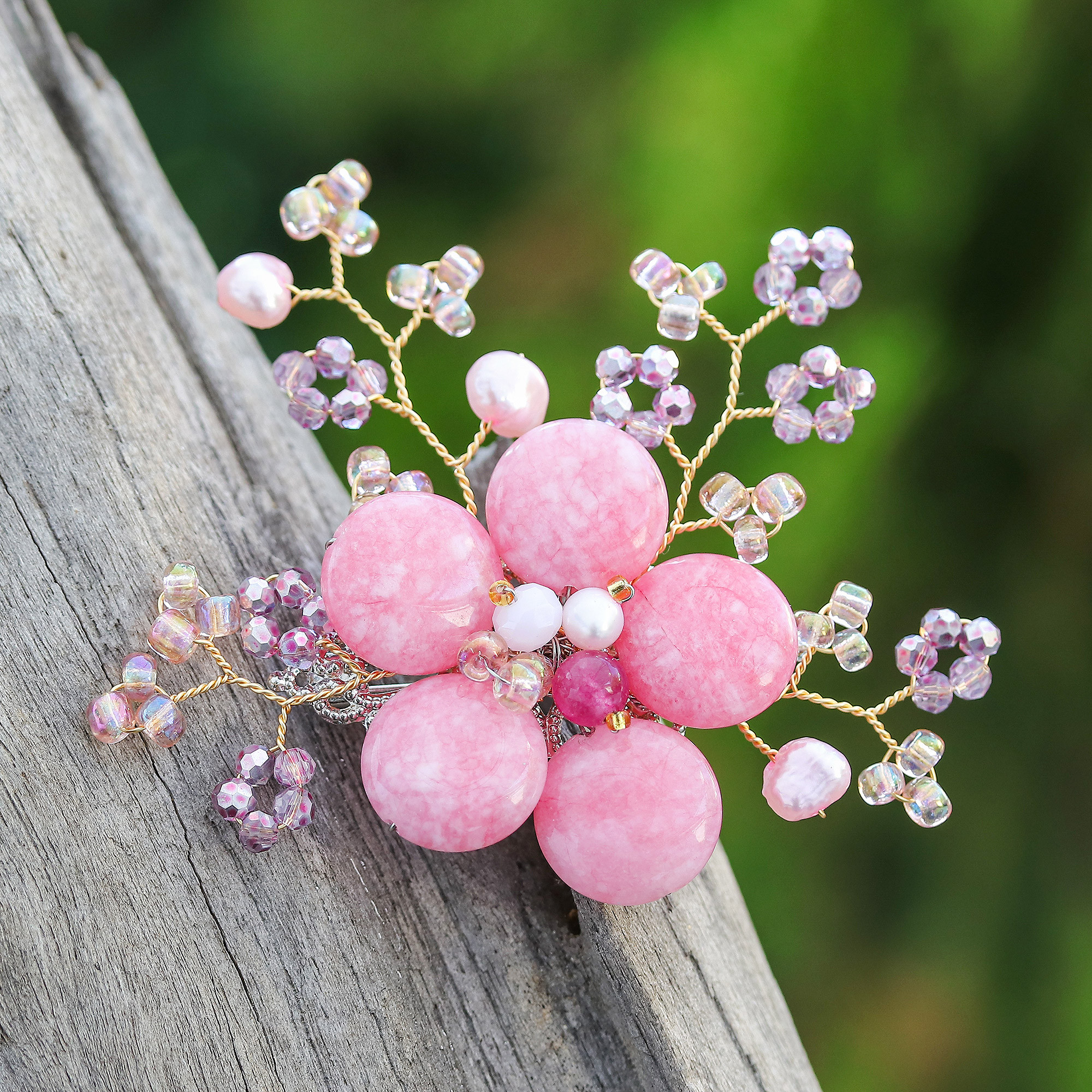 Let a spring of compassion and tenderness blossom in your soul with this precious creation from the Thai region. Nareerat explores the ethereal side of nature in this brooch pin, whose copper structure is crowned with quartz, cultured pearls and glass beads in a palette of pink hues, each forming a sweet flower.