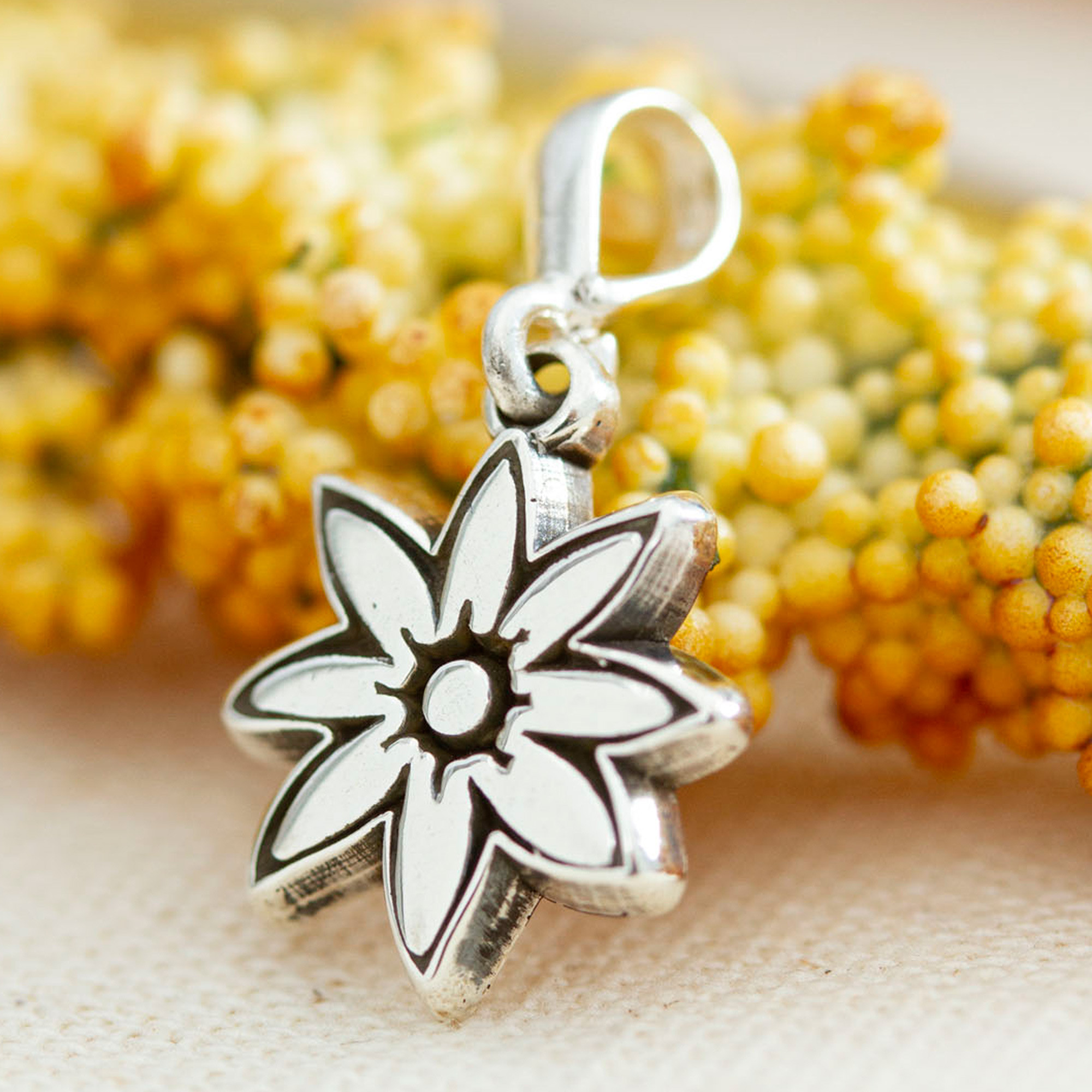 This exquisite sterling silver floral pendant harnesses the magic of contrasts, boasting oxidized and polished finishes dancing together in perfect harmony. Born from the legendary Taxco silversmithing tradition, yet unmistakably contemporary, Mexican artisan Angel Ortiz's precious creation will complement any look to perfection whether you're dressing up or keeping it casual.