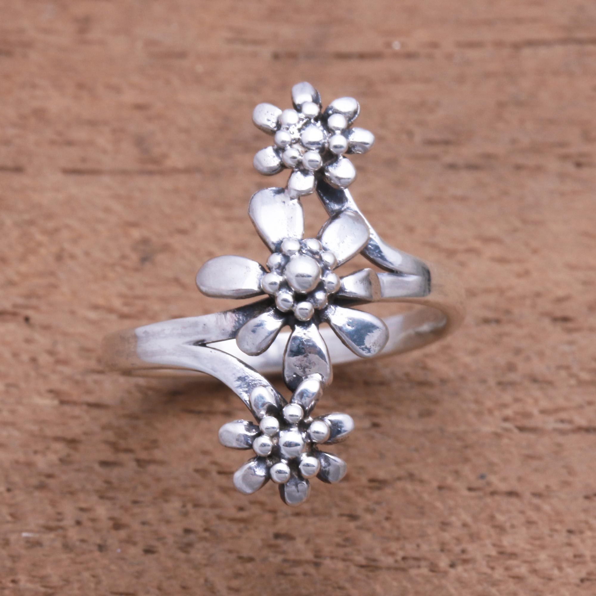Handcrafted from sterling silver, a trio of flowers forms a bouquet. Designed by Balinese artisan Made Darmada, this cocktail ring circles the finger with a simple sterling band.