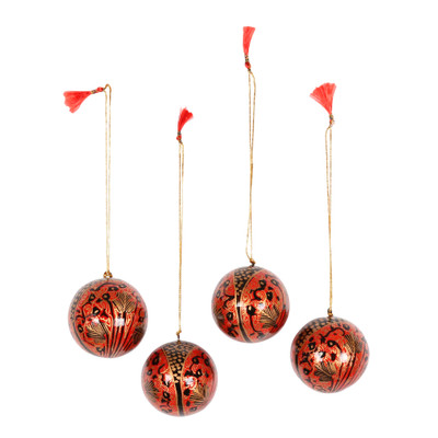 Folk Art 4-Piece Red and Golden Papier Mache Ornament Set, 'Holiday Glow'