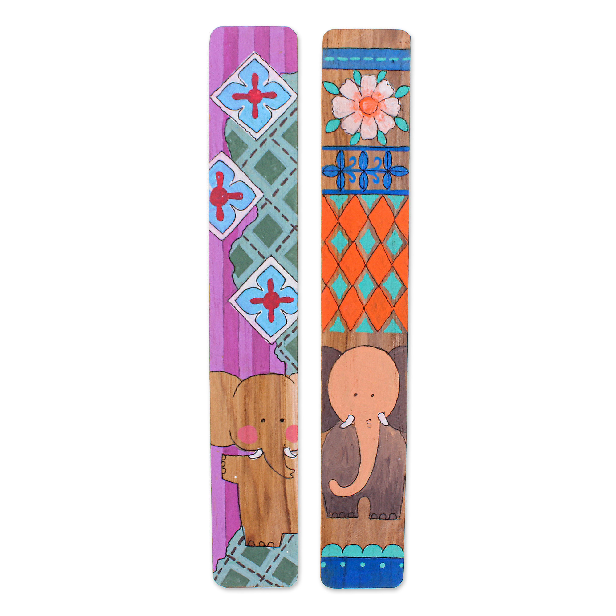 Folk-Art-Inspired 2-Piece Painted Wood Elephant Bookmark Set, 'Thai Adventures'