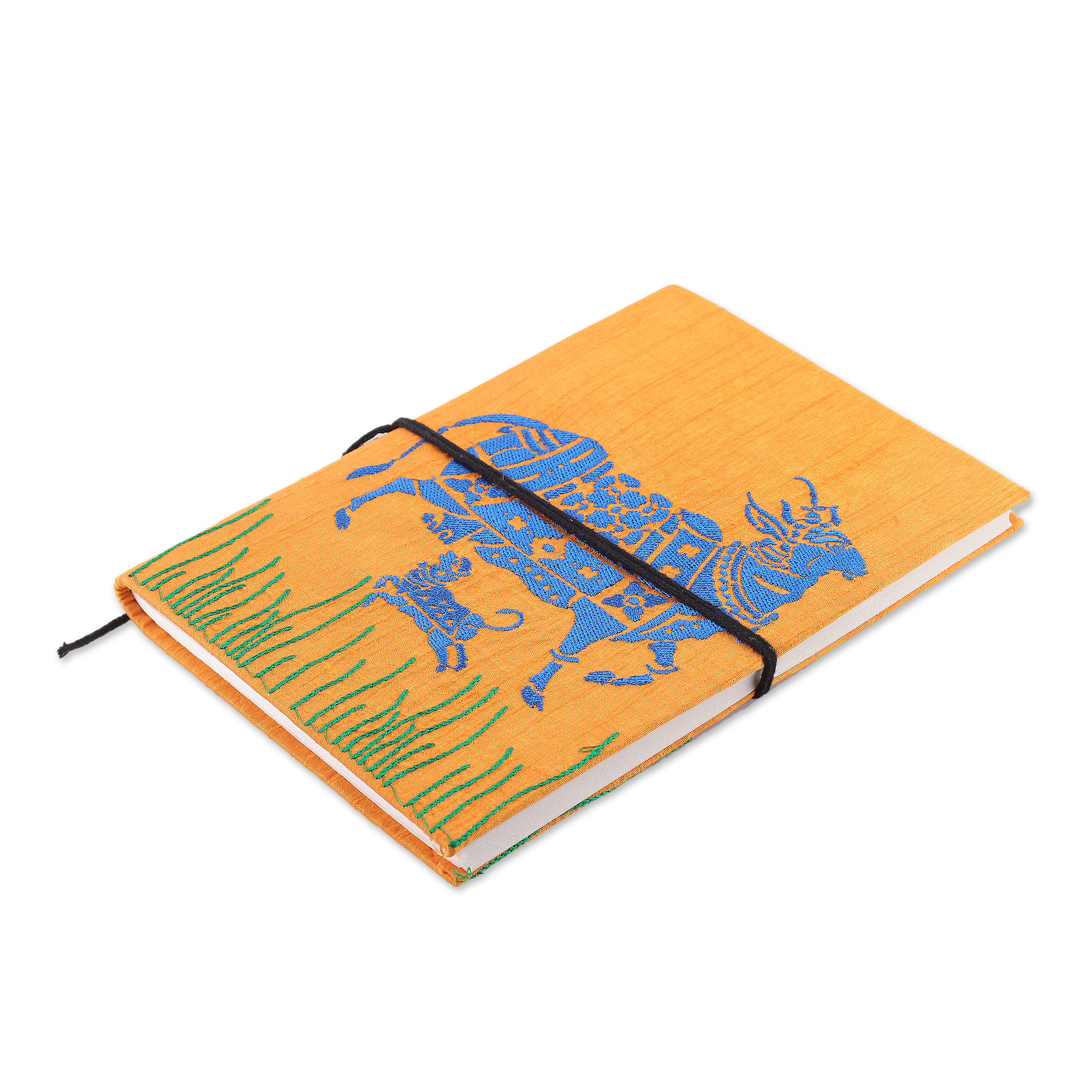 Kamadhenu, the goddess of abundance, visits your memories alongside her calf, inviting you to tell your adventures in the 58 pages that compose this handmade paper journal. Rayon threads decorate this classic piece, made by Asha Prabha's artisan team as an homage to the region's traditions. Equipped with a sturdy cover, the piece has a strong cotton binding.