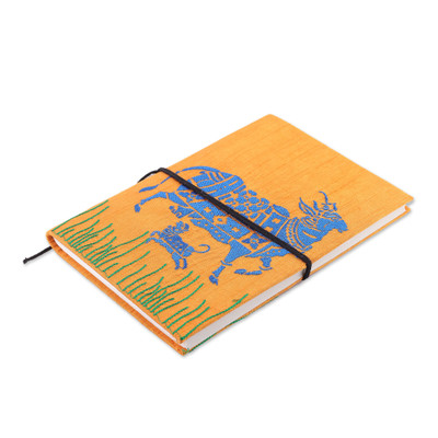 Folk Art-Inspired 58-Page Handmade Paper Journal from India, 'Kamadhenu in Saffron'