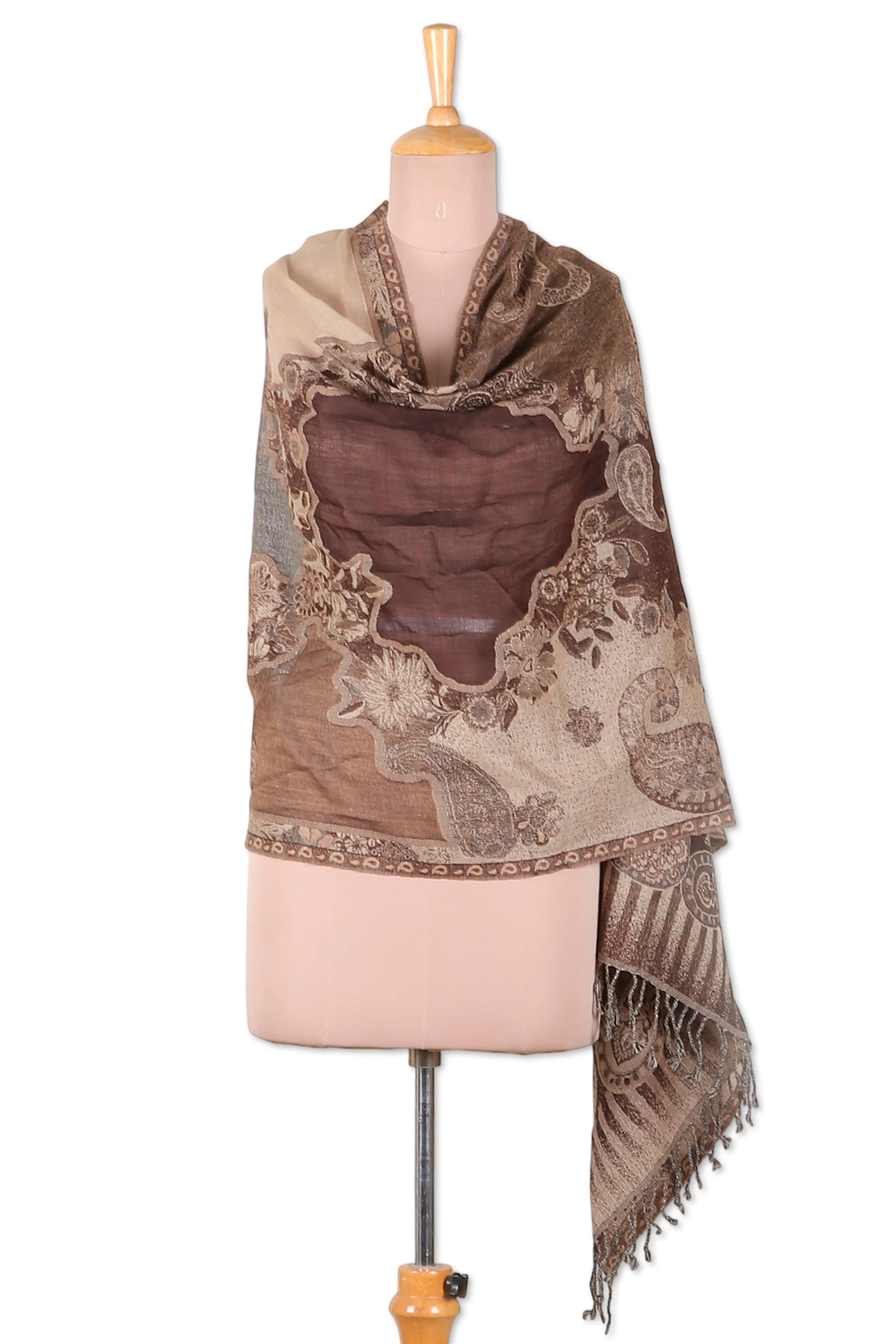 Folk Art-Inspired Paisley-Patterned 100% Wool Shawl in Brown, 'Sylvan Paisley'