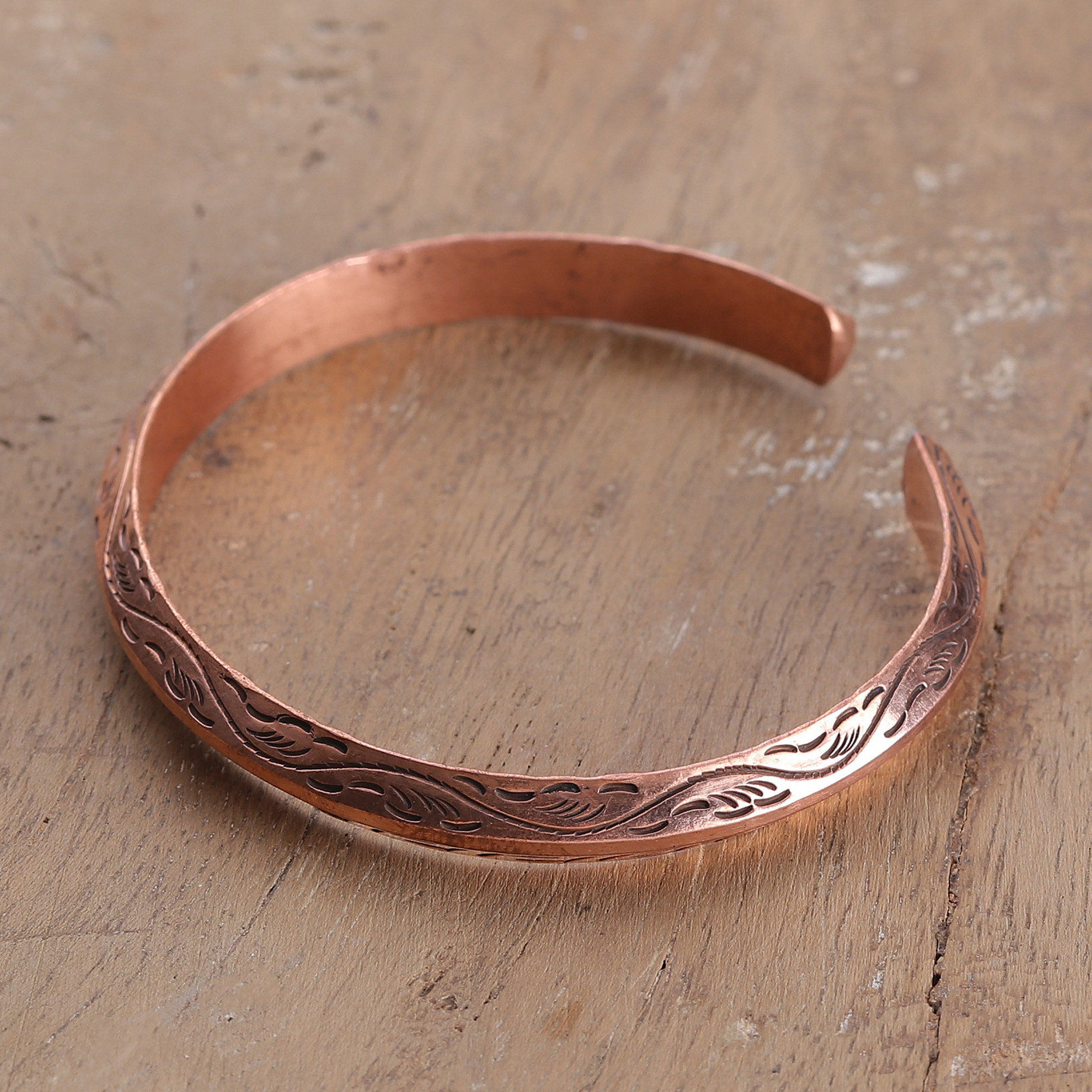 Traditional details and spring-themed motifs make this copper bracelet an homage to India's traditional jewelry arts. Made by artisan Sumit Dhawan, this distinguished piece immortalizes each accent with an embossed technique, combining polished and oxidized finishes.