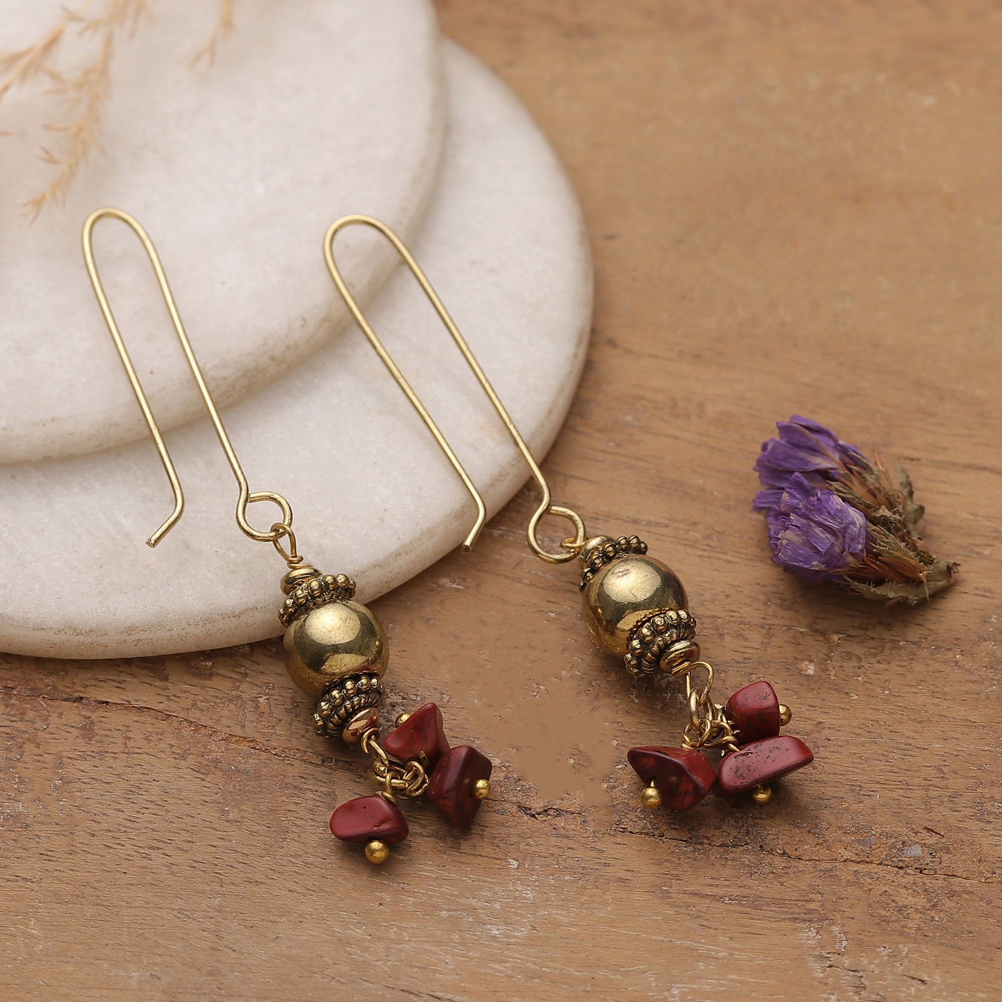 Folk Art-Themed Polished Brass and Agate Dangle Earrings, 'Bold Gala'