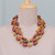 Inspired by bohemian trends and artistic traditions, Rahul Jain's station necklace arrives to seduce with a joyous aura. Local artisans work with haldu wood to craft each bead, merging their brown hue with three strands of yellow cotton cords. A button clasp crowns the necklace with convenience.