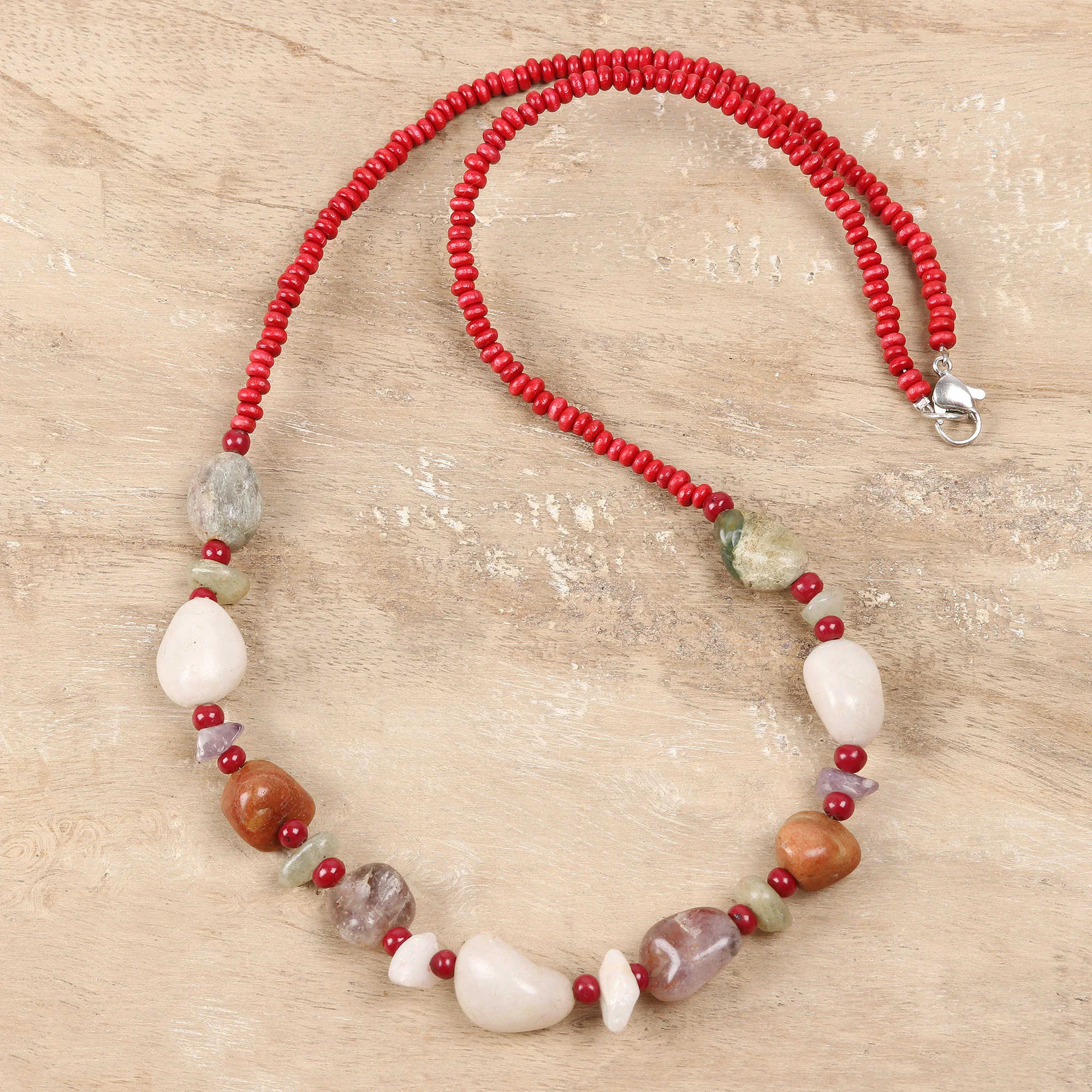 In a glorious array of shapes and hues, freeform agate gemstones center this long necklace from India. Sabir designs this necklace, which circles the neck with beads of red haldu wood and resin.