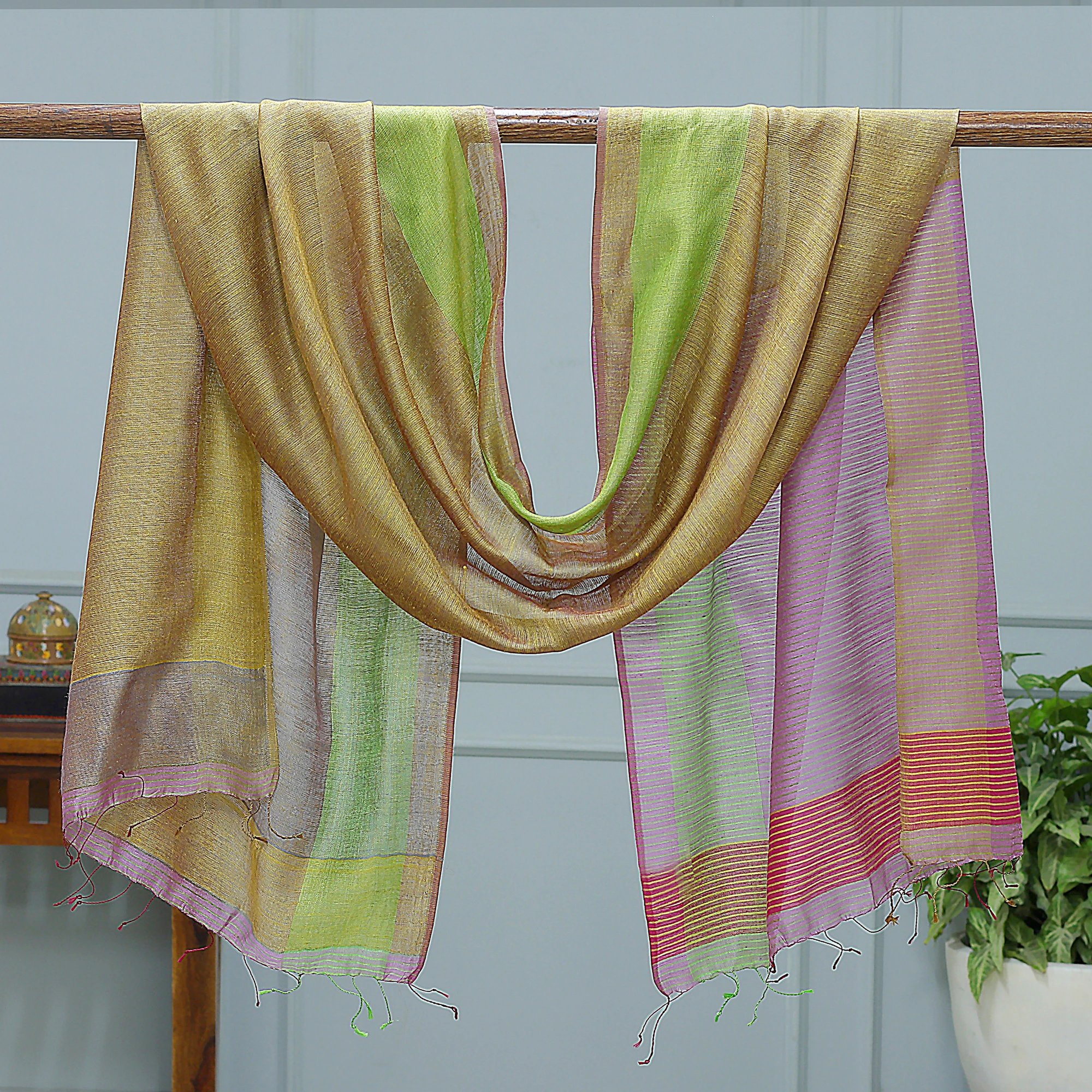A realm of harmony awakens in the stripes and details that compose Khitish's newest shawl. Indian artisans work with traditional techniques to craft this silk piece, whose palette of purple, red, yellow and green hues creates two charming styles for a reversible design.