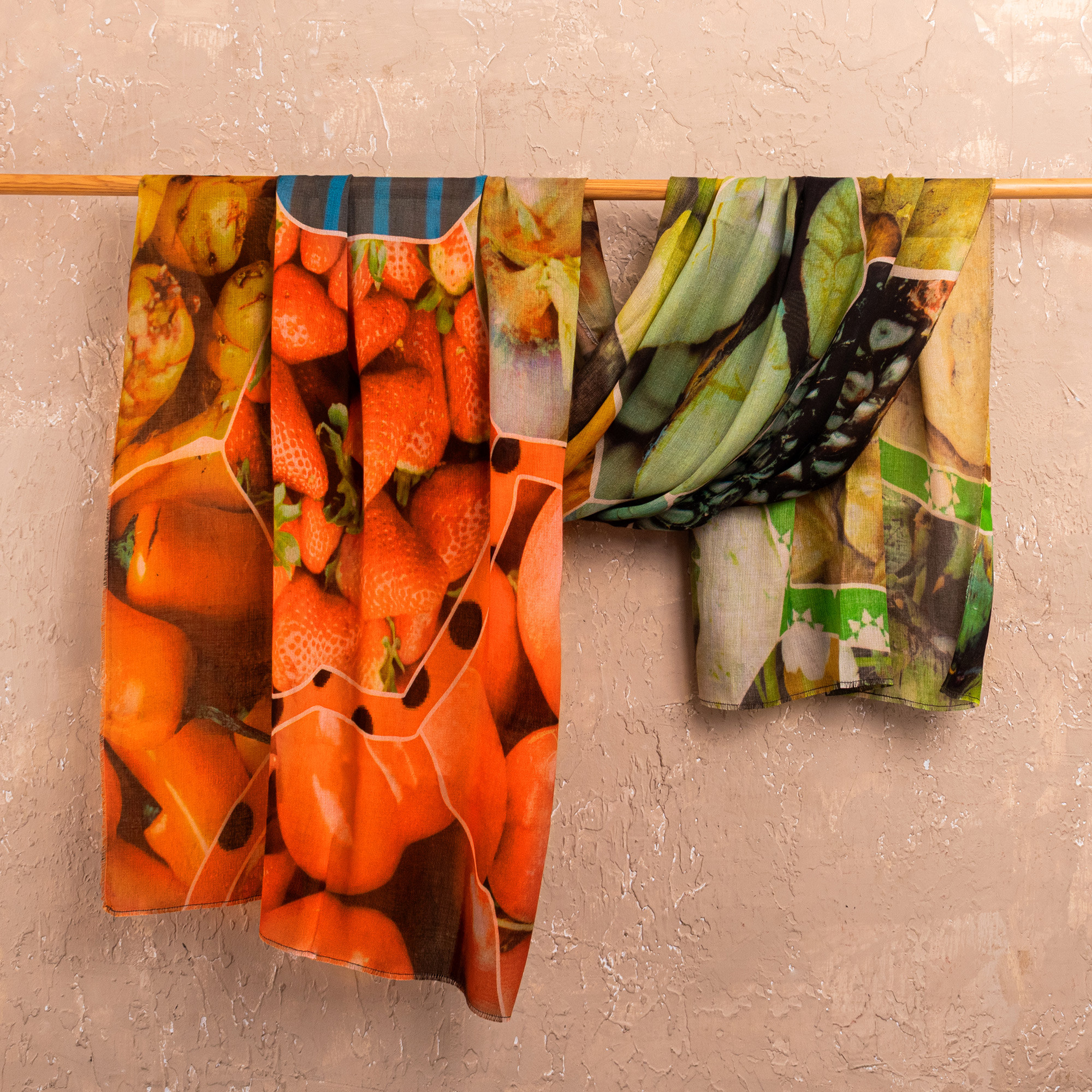This unique shawl is created by Peruvian artisans Raquel and Gregor. Printed with digital technology, the woven modal shawl features a collage of colorful fruits and vegetable photos.