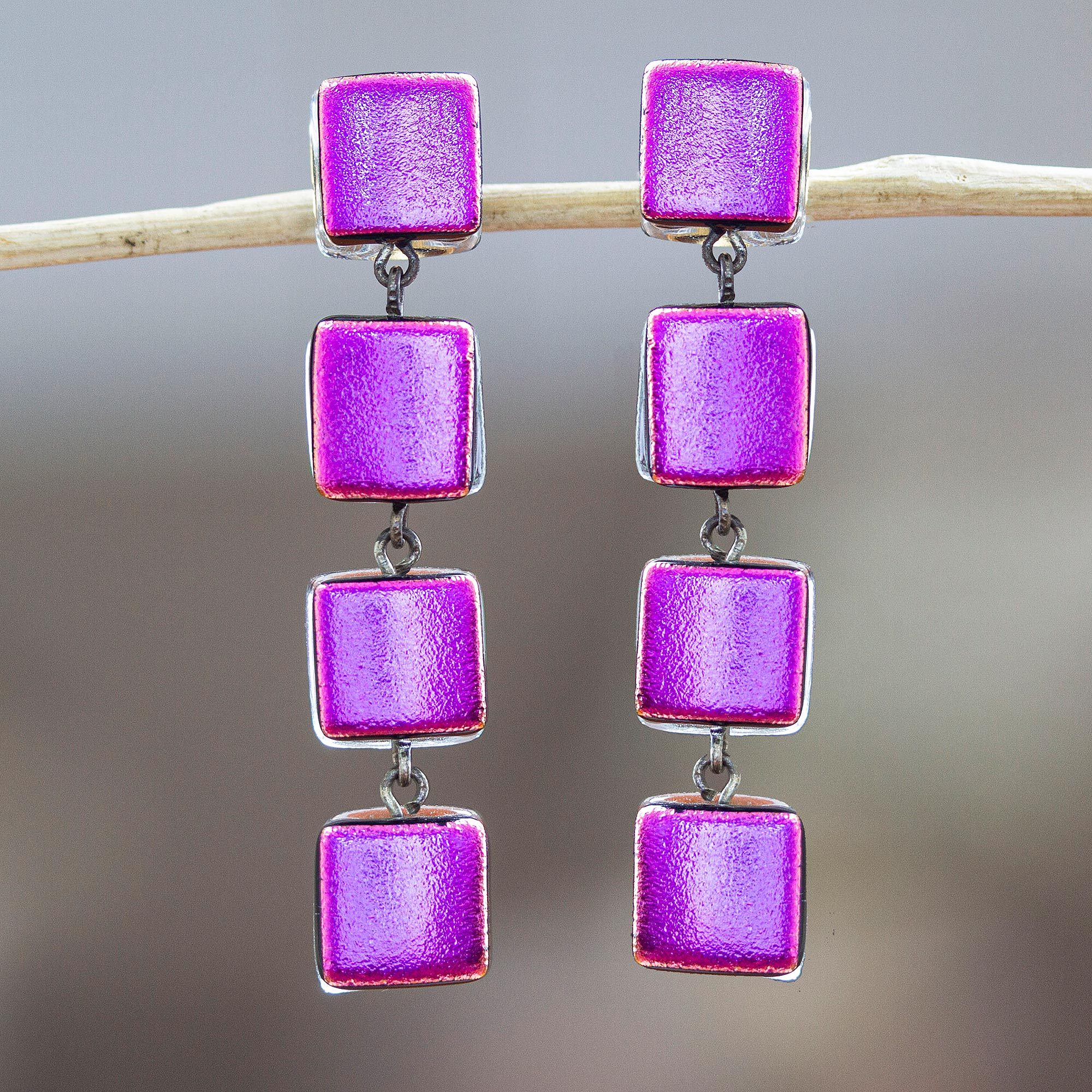 Mexico's Fabiola Quevedo works with the traditional dichroic glass technique to create a pair of dangle earrings of iridescent beauty. Featuring 18k gold-plated nickel posts and clasps, the art glass earrings come in a spectacular fuchsia shade for a fashionable look.