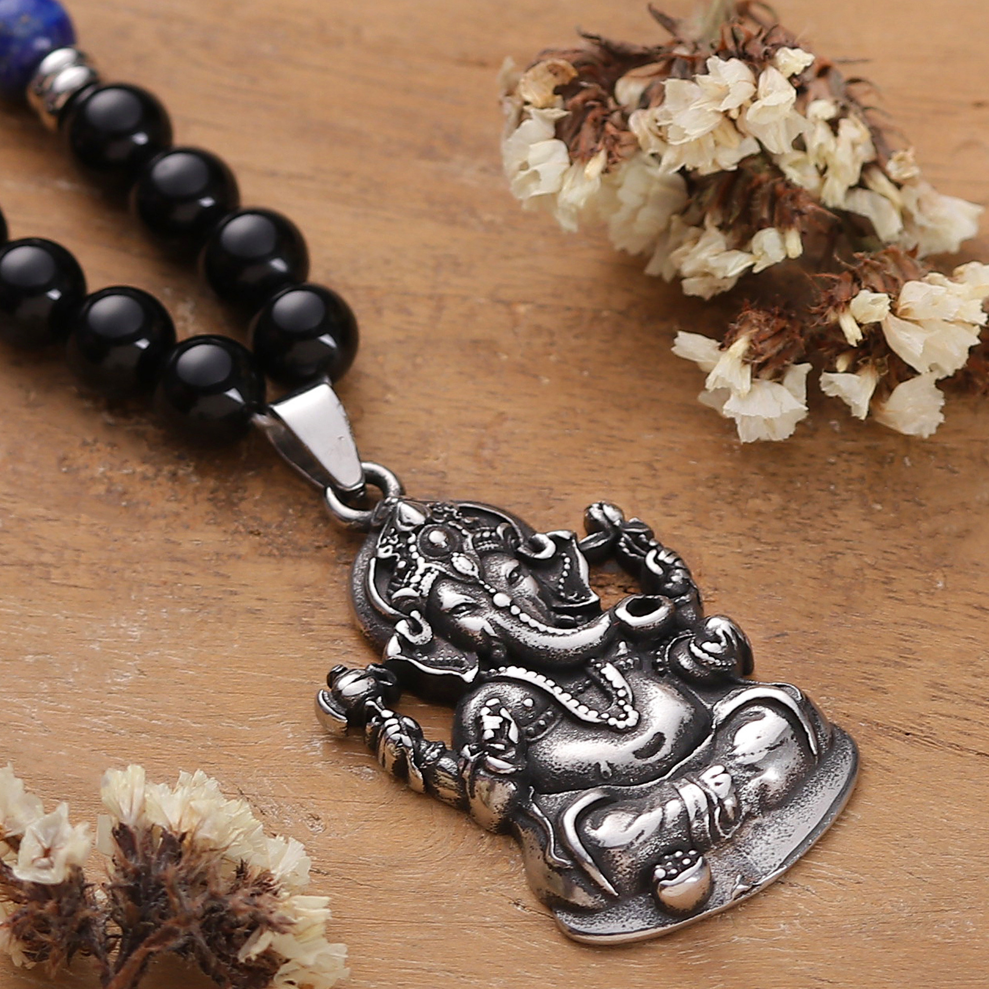 The Hindu god Ganesha, known as the remover of obstacles and instantly recognizable thanks to his elephant-shaped head, graces this exceptional pendant necklace by Indian designer Sumit Dhawan. The textured stainless steel pendant dangles from a strand of grounding black onyx and wisdom-enhancing lapis lazuli beads, making it the ideal accessory for meditation sessions, yoga classes and beyond.