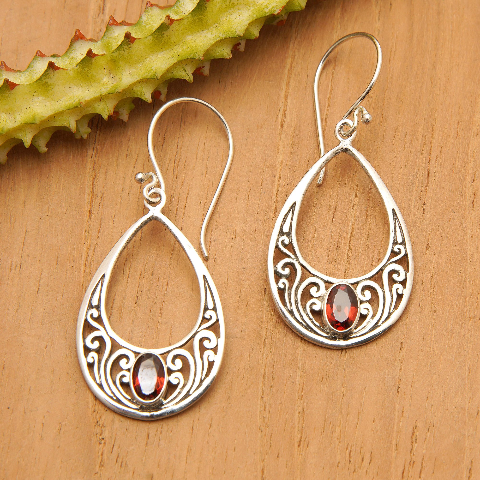 Oval stones of faceted red garnet rest at the center of these dangle earrings from Bali. Komang Suastra crafts these beautiful earrings of sterling silver in teardrop shapes with openwork spiral motifs.