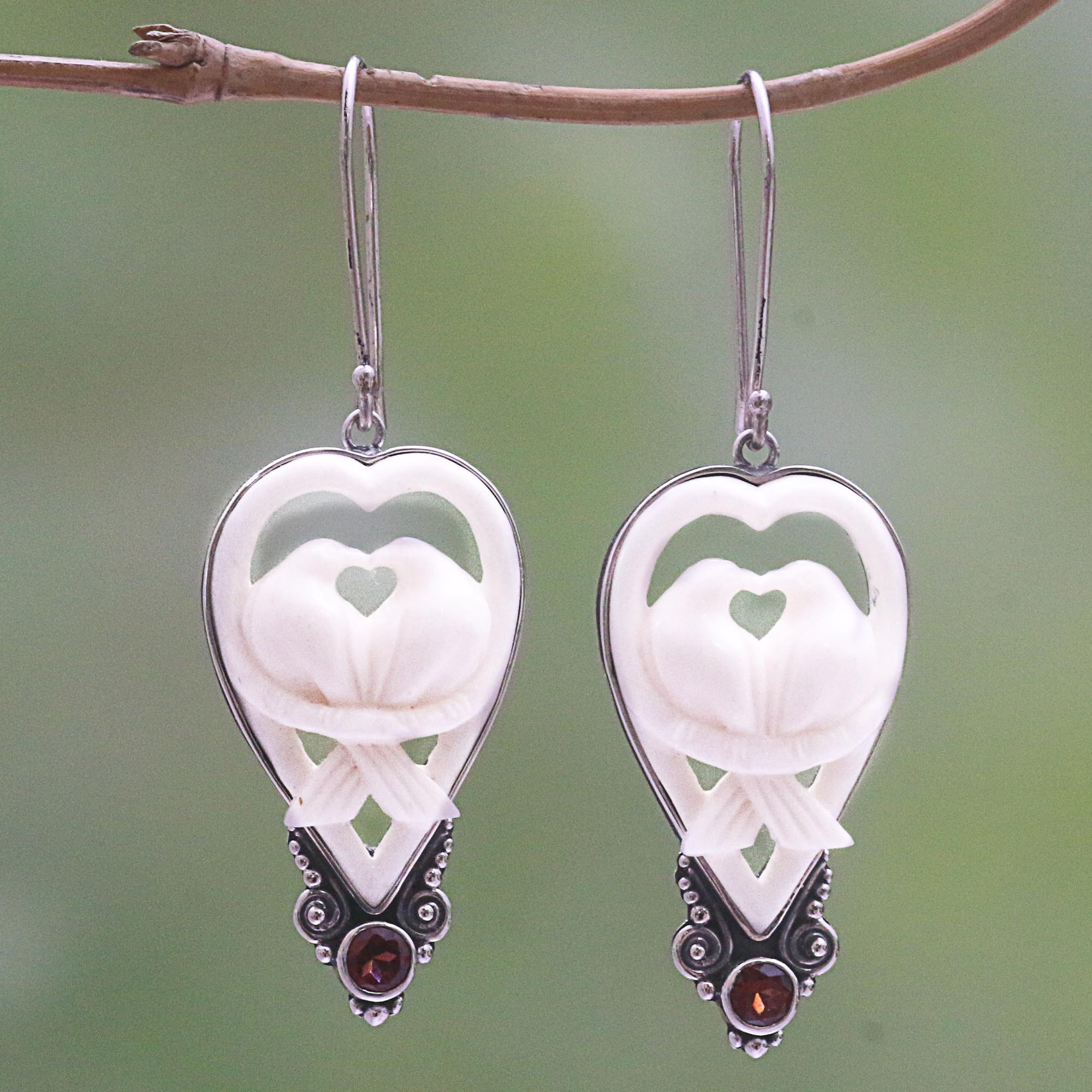 Sharing a romantic moment, two loving doves are carved by hand from bone, displayed within this pair of heart-shaped dangle earrings from Bali. Made Wardika designs these earrings, framing the design with sterling silver. A petite gem of faceted garnet is displayed at the bottom of each earring.
