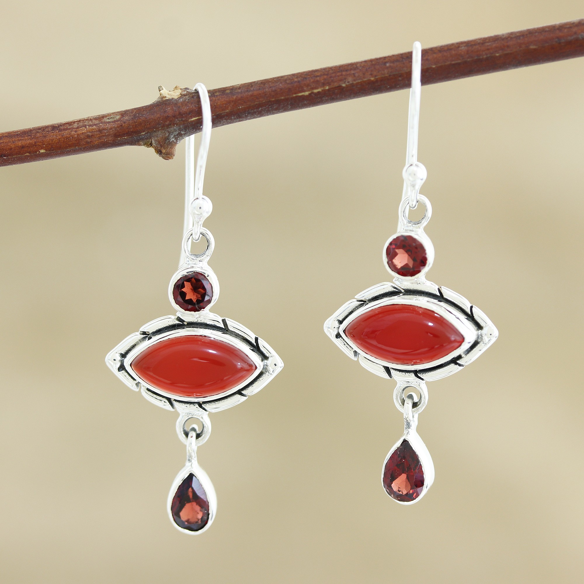 Garnet and Carnelian Sterling Silver Dangle Earrings, 'Red Fusion'
