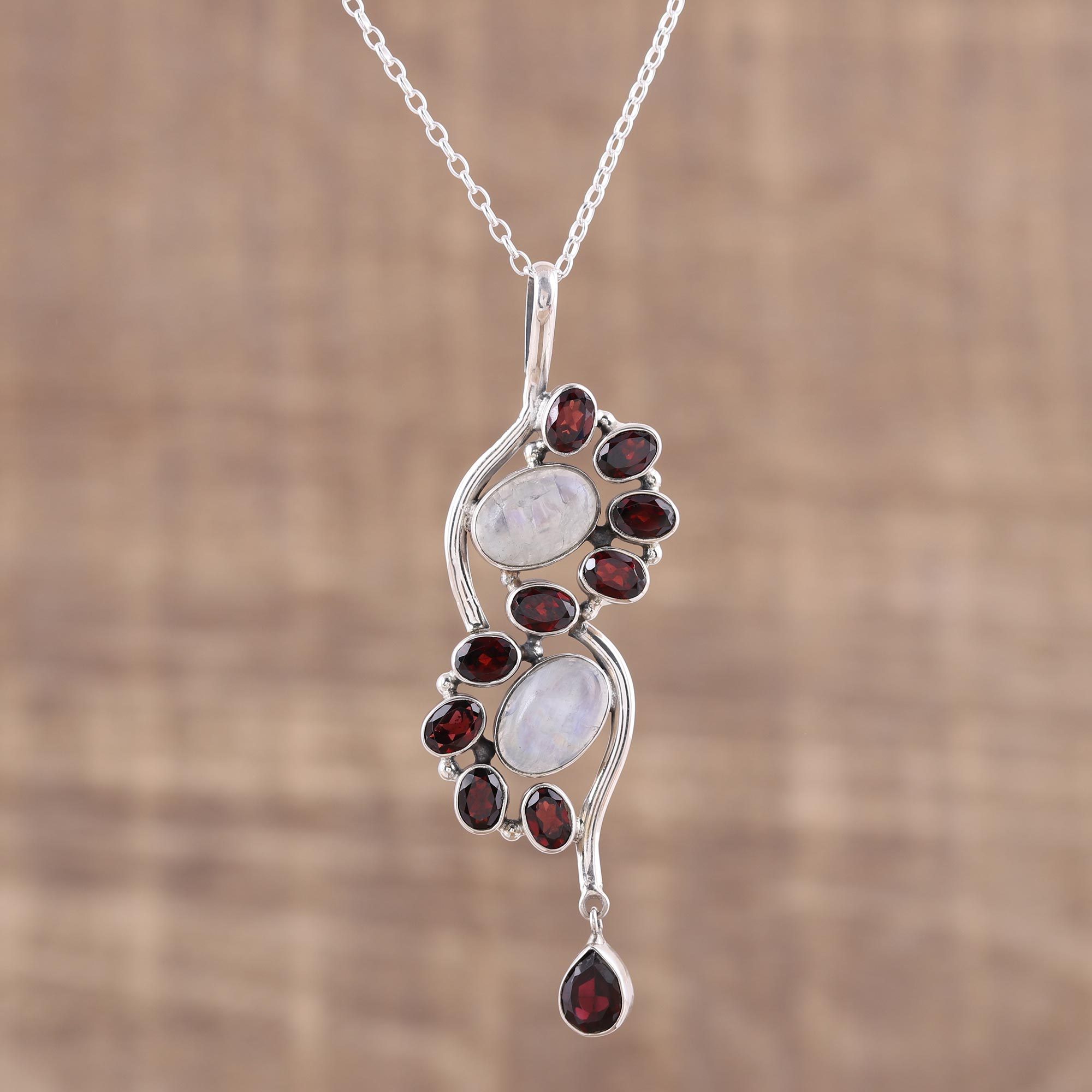 Forming a spiral-like shape, over ten carats of faceted garnet gems accentuate two oval cabochons of iridescent rainbow moonstone. This Indian pendant necklace is crafted with sterling silver, and presented by Neeru Goel.