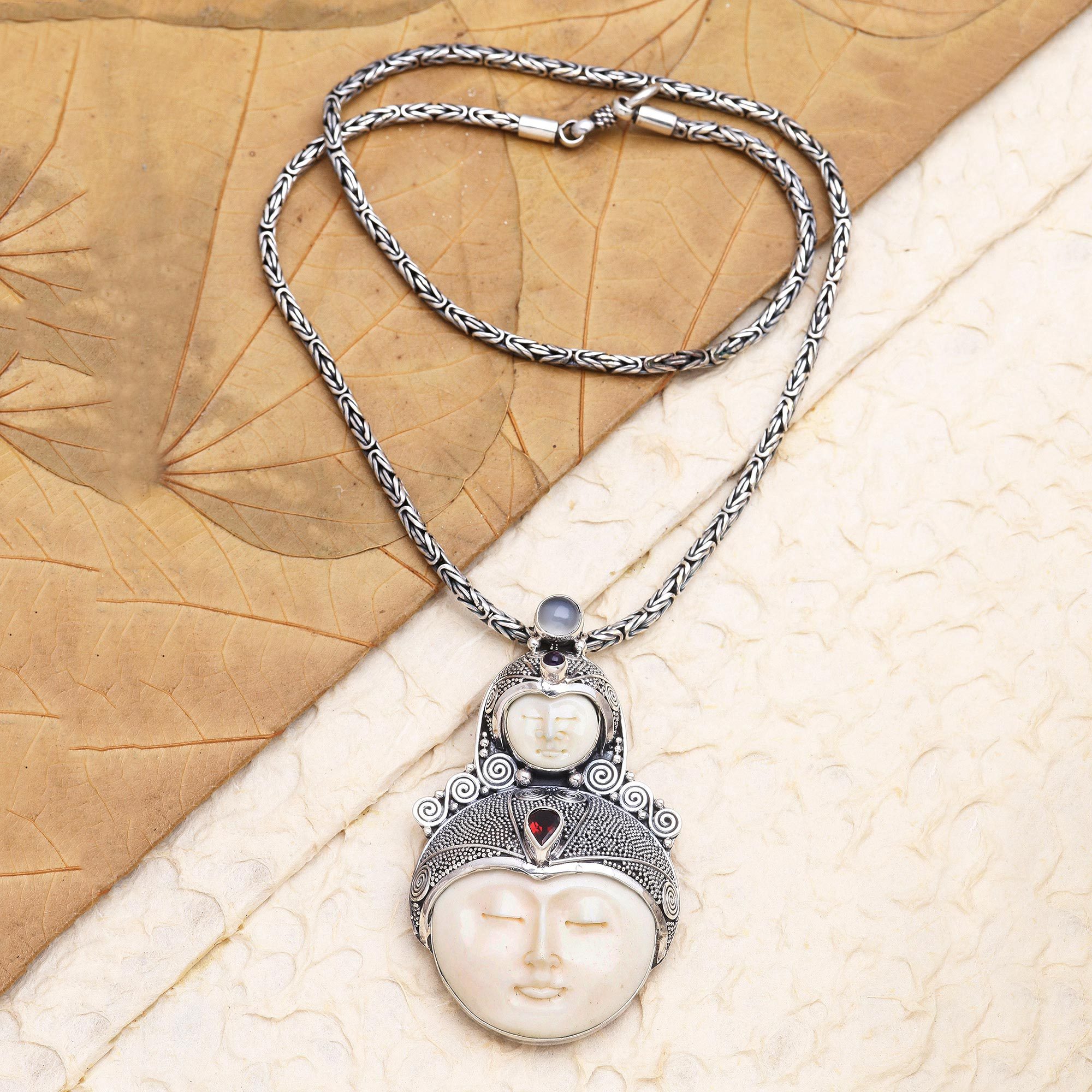 Capture the elusive mother moon with this exquisite necklace designed by Bali's Komang Suastra. The artisan crafts two faces, large and small, from ivory-colored cow bone, embellishing the pair with sterling silver dot work and spirals. A petite garnet crowns the forehead of each face, while a round rainbow moonstone tops the pendant.