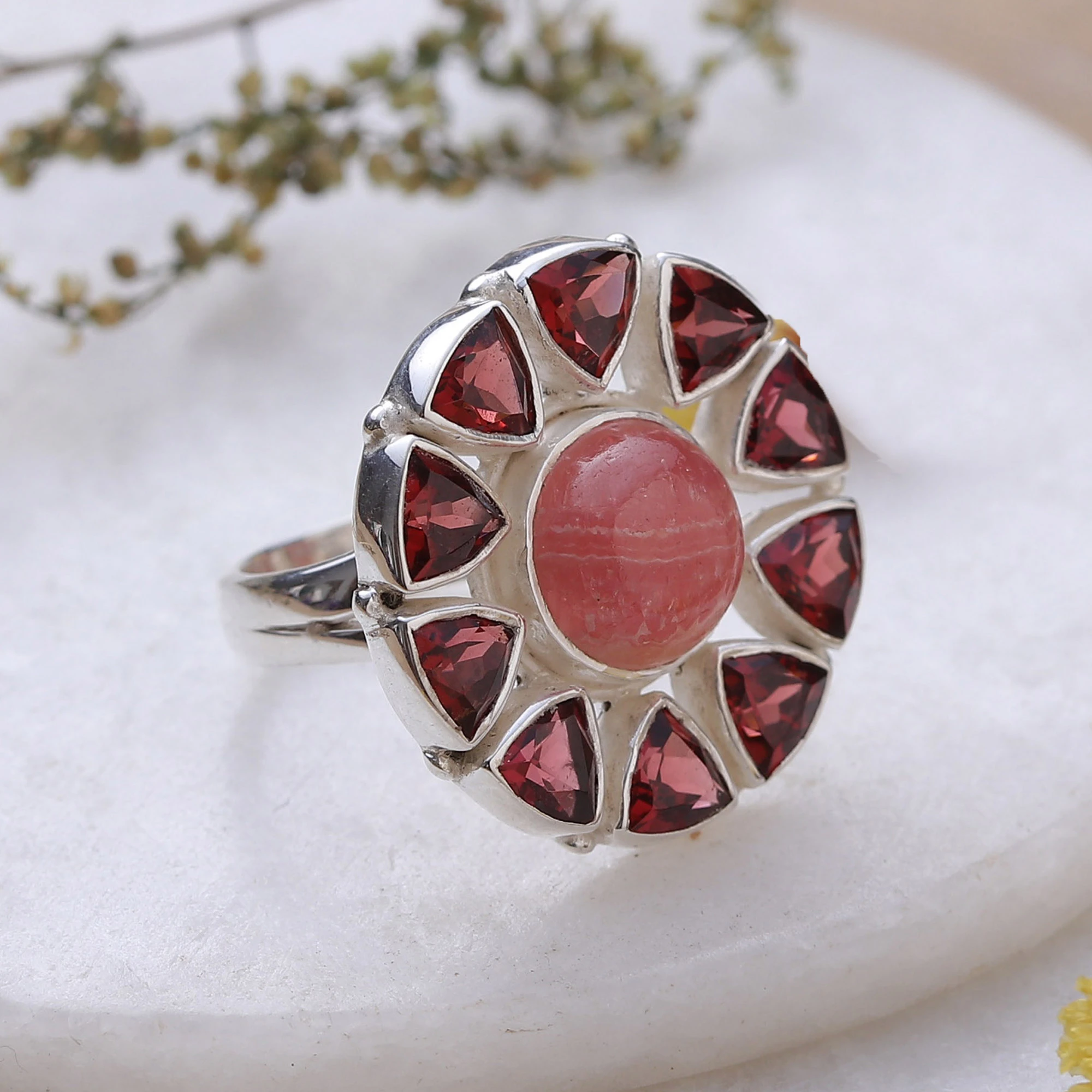 Designed with a modern flair, this cocktail ring is handcrafted from sterling silver. Ten garnets surround a rhodochrosite cabochon, creating a beautiful pattern of bold red tones and shining silver. Alok Jain of India designs the striking accessory. The garnets total three carats.