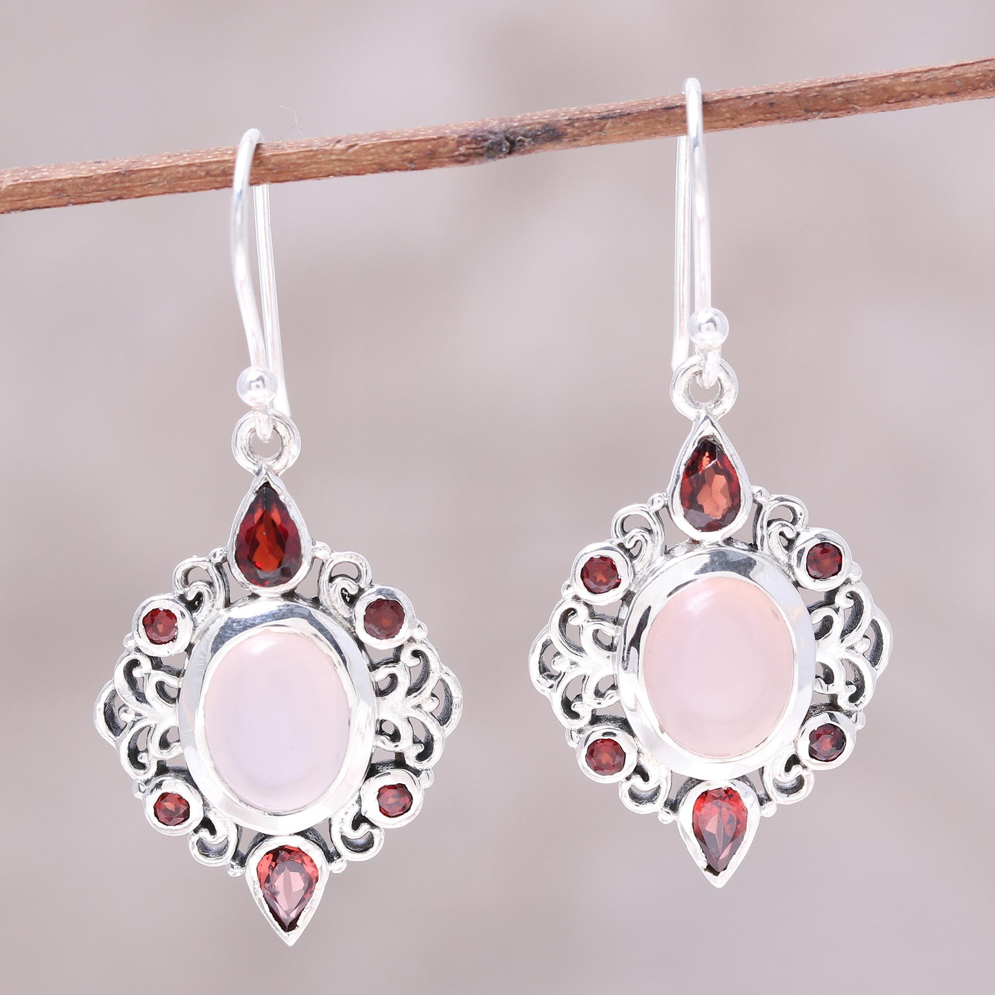 Dazzling and sophisticated, this pair of dangle earrings is intricately crafted from sterling silver. Neeru Goel of India designs the earrings, giving them a majestic air with glistening garnets and lovely rose quartz.