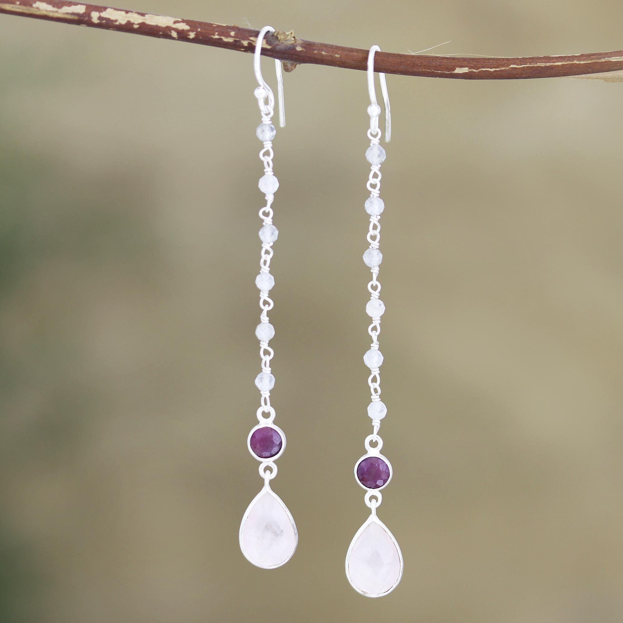 Designed to swing freely, Neetu Barathi's dangle earrings combine three pretty gemstones for a romantic effect. Indian artisans link faceted labradorite beads together with sterling silver jump rings, while rose quartz and garnet gemstones shimmer below.