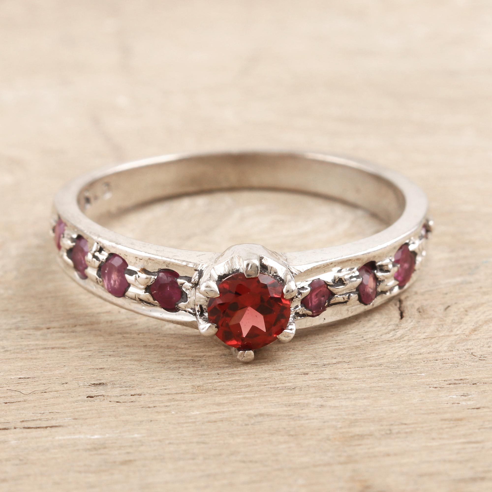 Bhavya Jain's beautiful ring combines a harmonious gemstone duo: sparkling red garnet and shimmering pink rubies. The Indian artisan centers the ring with a faceted garnet gem in a decorative prong setting, encrusting the sterling silver band with pretty faceted rubies.