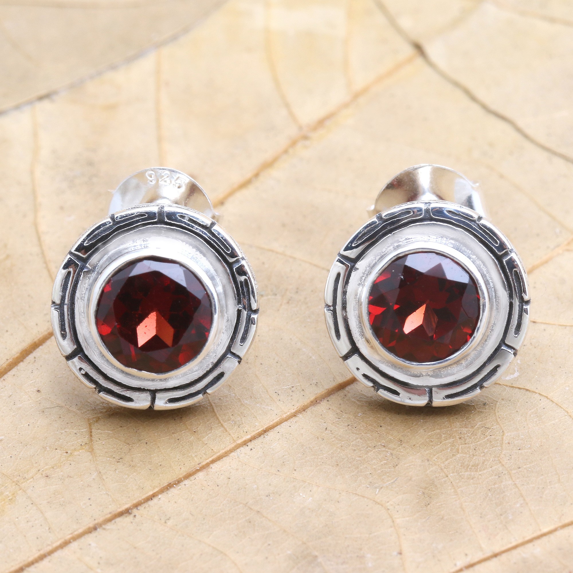 Surrounded by a clean graphic design, the red gemstones on Wayan Asmana's button earrings sparkle. Balinese artisans center each earring with a faceted garnet gem, engraving a sterling silver setting and frame with dark, oxidized details.
