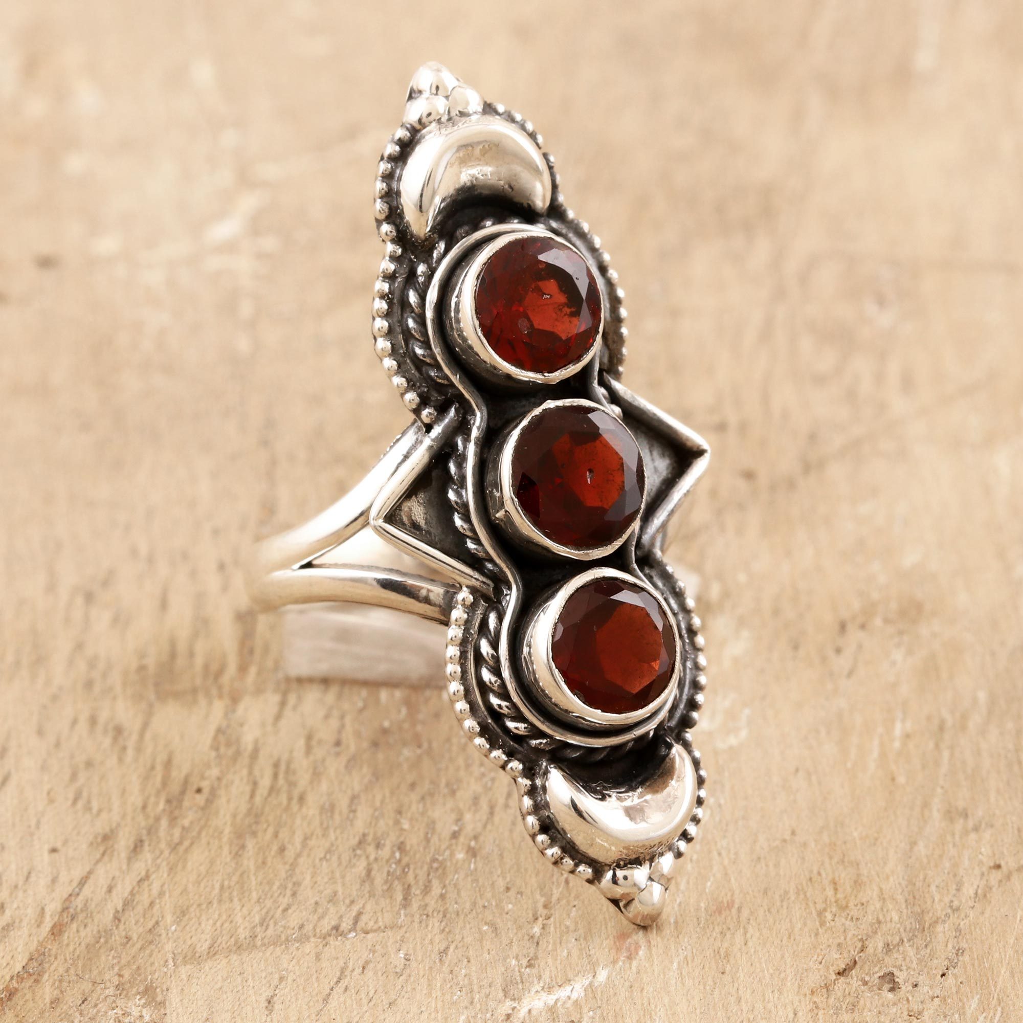 Rakesh Rana's elegant cocktail ring proves that three gems are better than one (or two). The Indian artisan uses three faceted garnet stones in bezel settings to create the ring, circling the gems with sterling silver roping and shining crescent shapes.