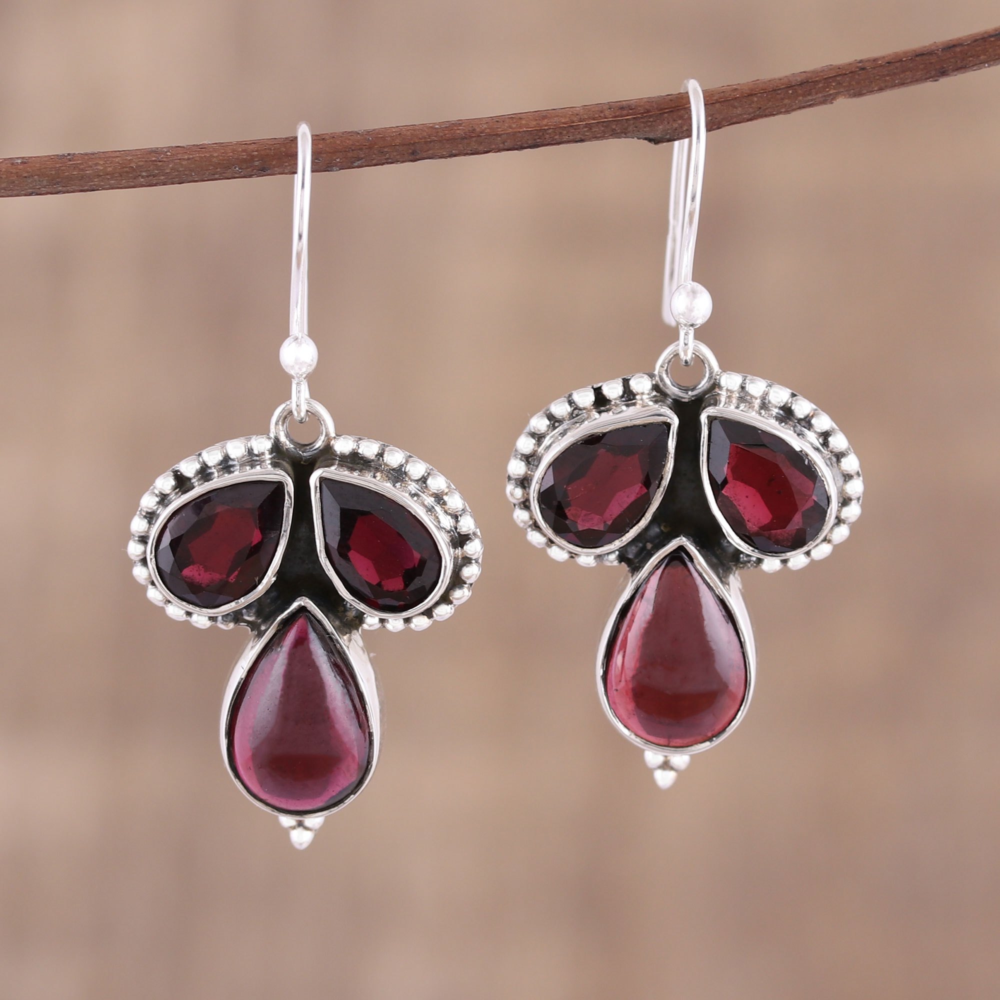 A trio of teardrop garnet stones, two faceted and one cabochon, shines brightly in this pair of dangle earrings from India. Neeru Goel expresses her childhood passion for jewelry and gemstones, giving these earrings a handcrafted design from sterling silver with petite dot motifs accentuating the stones, which total six carats.