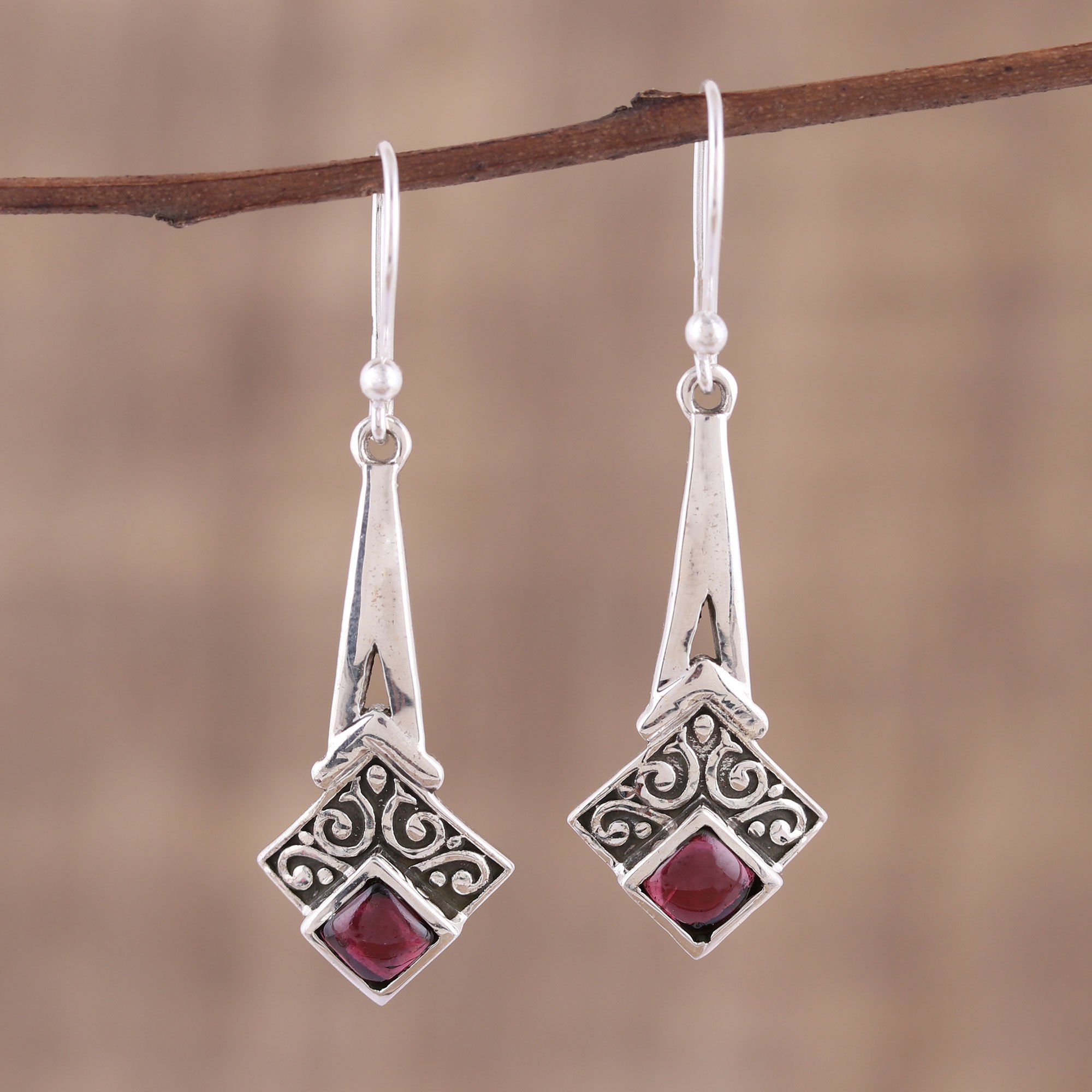 Garnet and Sterling Silver Dangle Earrings from India, 'Timekeeper'