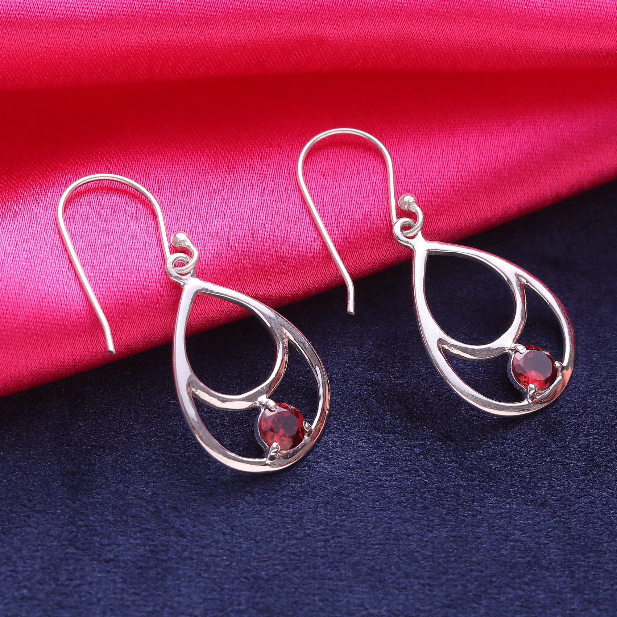 Two open, teardrop frames of sterling silver cradle a round faceted garnet in these lovely earrings. Chintan of India presents these elegant and airy handcrafted dangle earrings.