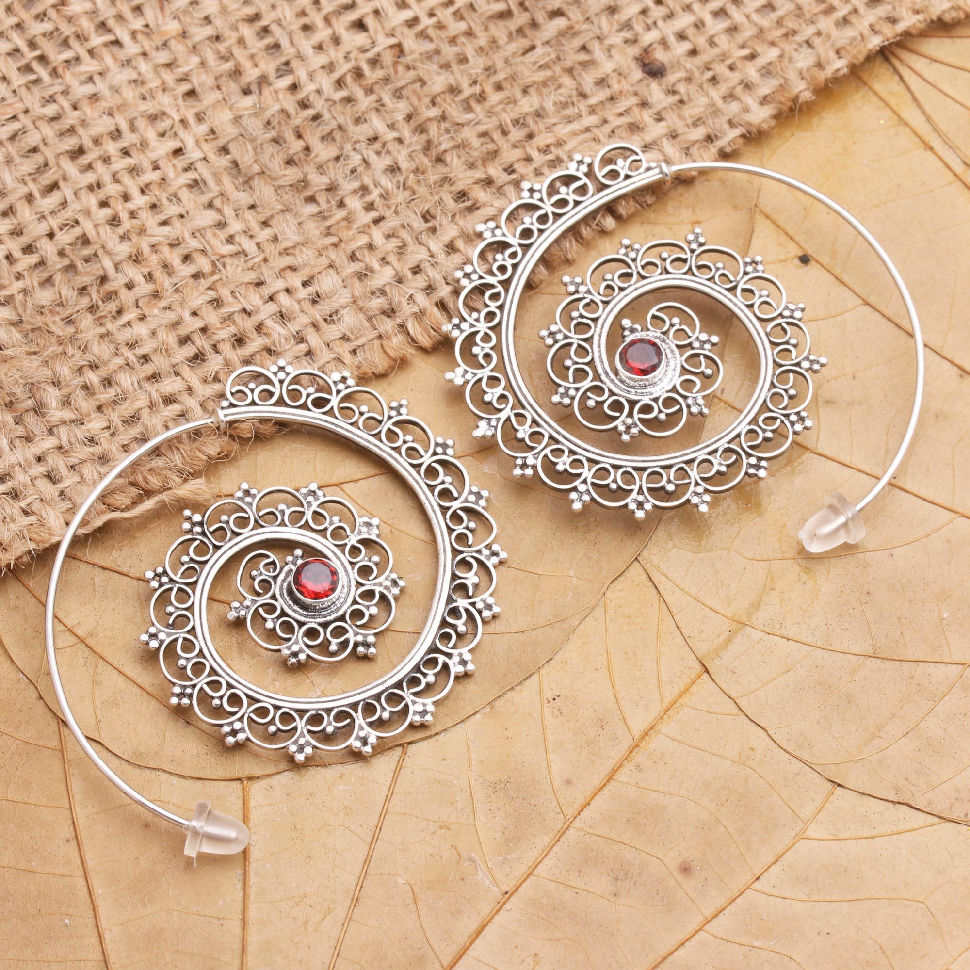 Presented by Sukartini, these elegant drop earrings harness the spiritual power of the spiral, an ancient geometric shape found throughout the world. Balinese artisans start by hand crafting a slim spiral from polished sterling silver, skillfully leading the eye toward a faceted garnet gem that glows at the pair's center.