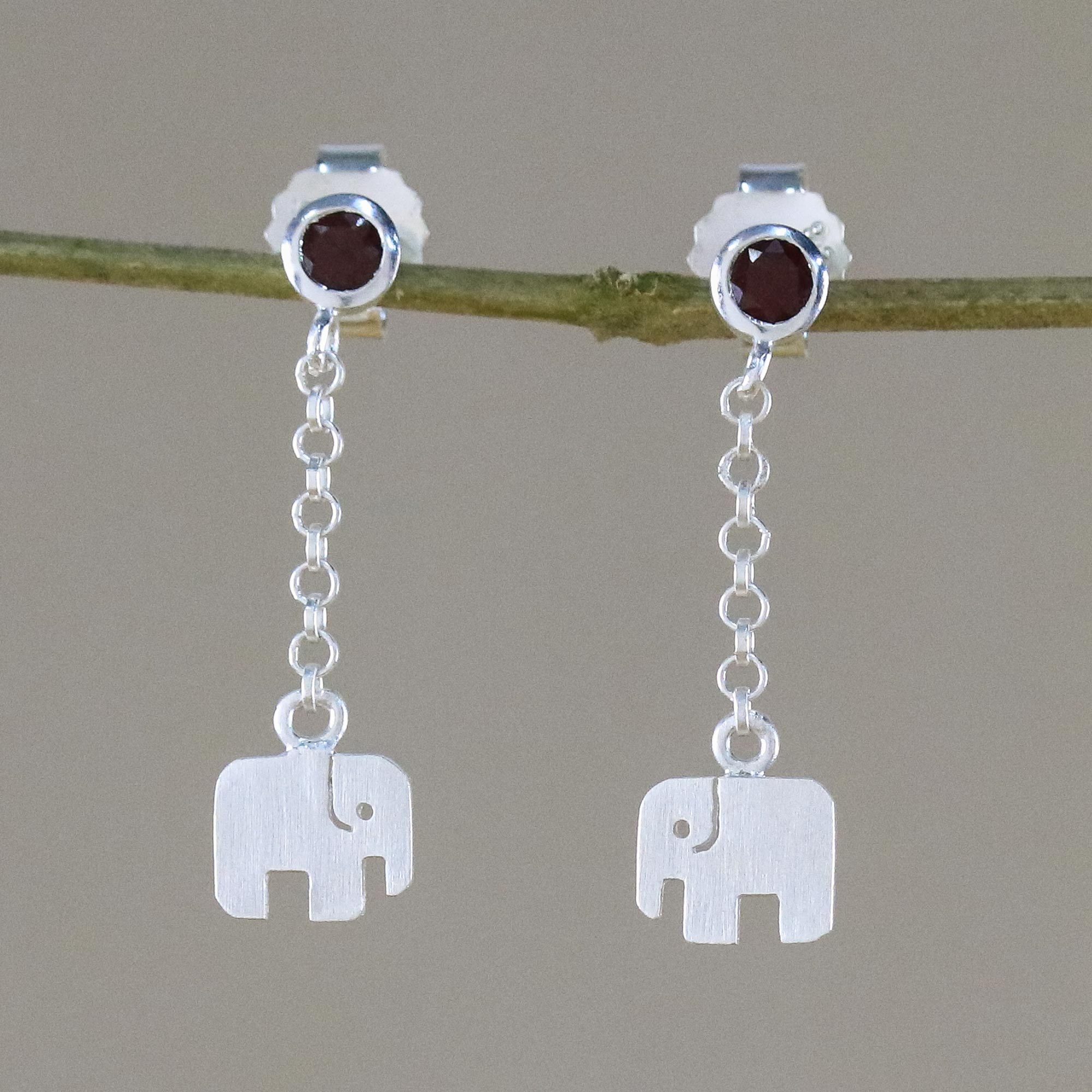 Two fun-loving little elephants, crafted of sterling silver with a brushed finish, swing on petite lengths of chain. Thailand's Jantana designs these cute dangle earrings, adding stones of natural garnet.