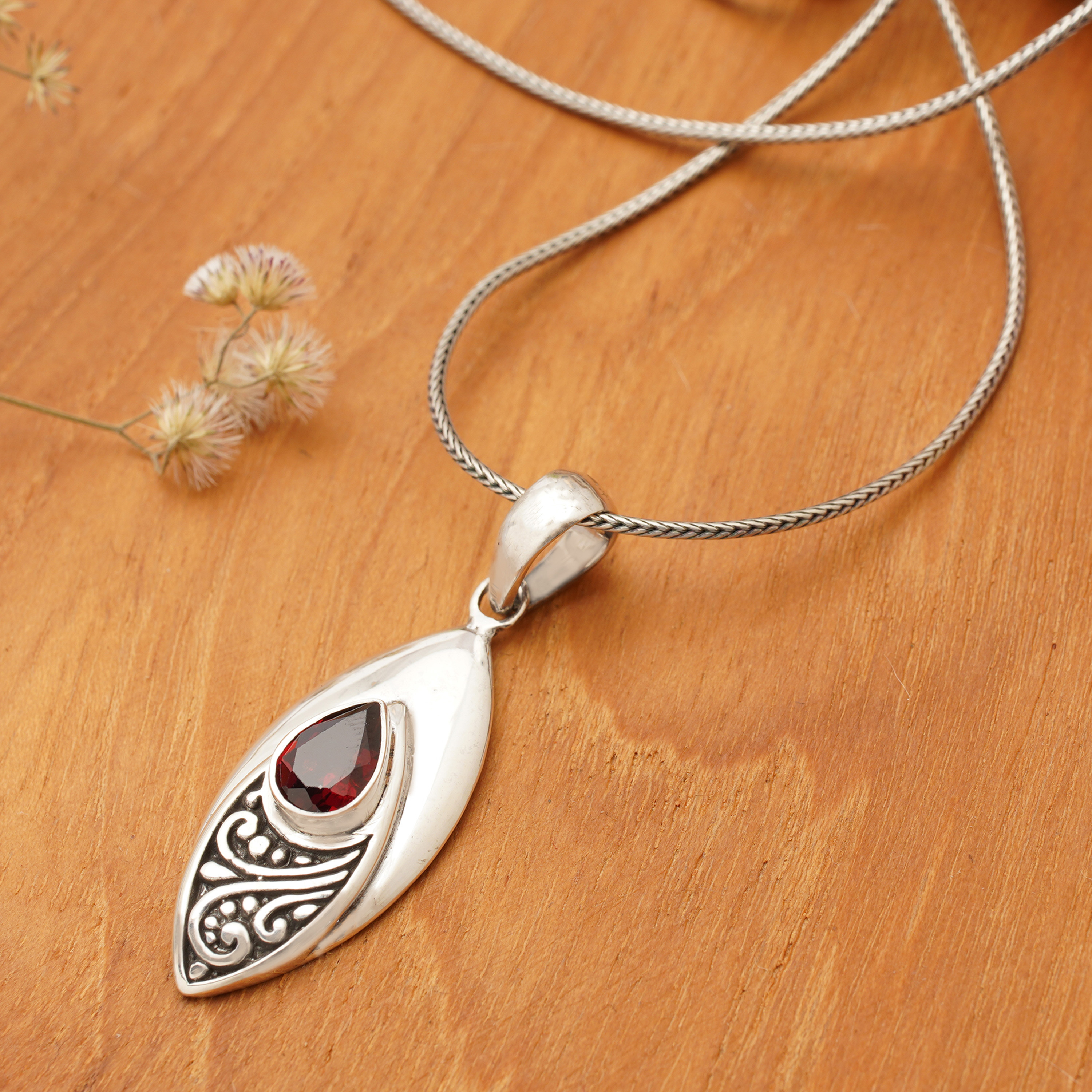 Shaped like an eye, this pendant from Kenari in Bali is replete with exotic style. The sterling silver pendant contrasts a smoothly polished exterior surface against an oxidized center that has been detailed with traditional bun (wirework) and jawan (dot) motifs. With a 'pupil' of gleaming red garnet, the pendant is mesmerizing. It centers a sterling silver foxtail chain.
