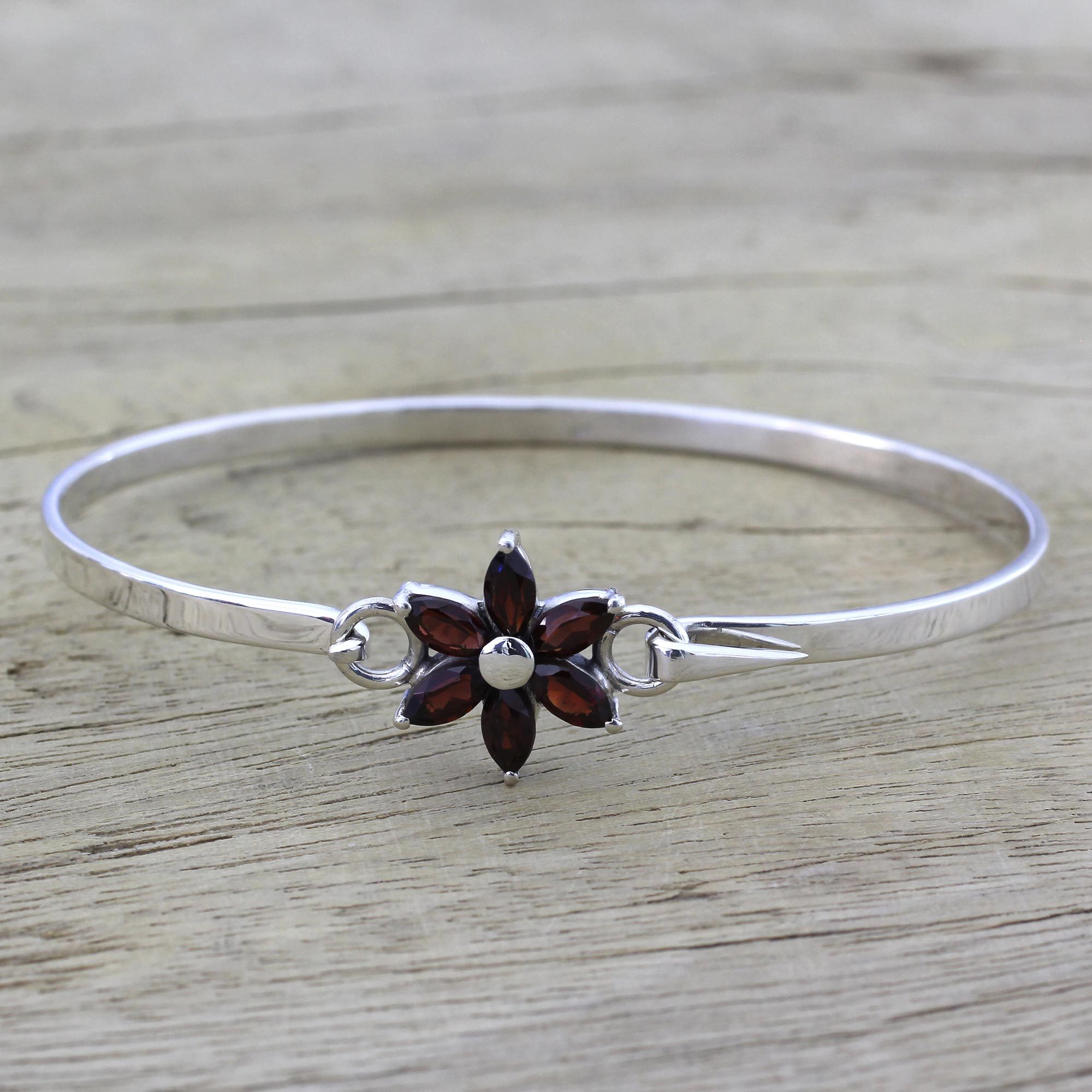 A dainty flower is formed by red marquise garnets totaling over one carat. The blossom centers a band of sterling silver for an elegant pendant bracelet. From Shanker, this delightful design is crafted by hand in India.