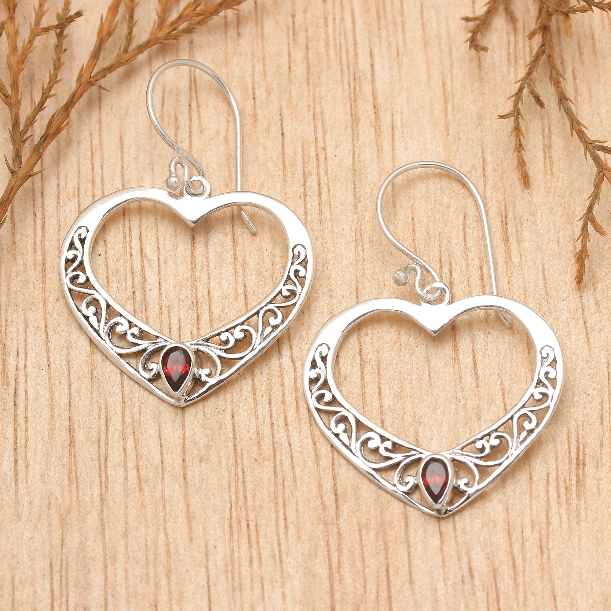 Balinese artisan Komang Suastra crafts this loving pair of dangle earrings of sterling silver in the shape of hearts, filled with elegant spiraling vine motifs. Each earring features a teardrop stone of faceted garnet with enchanting red hues.