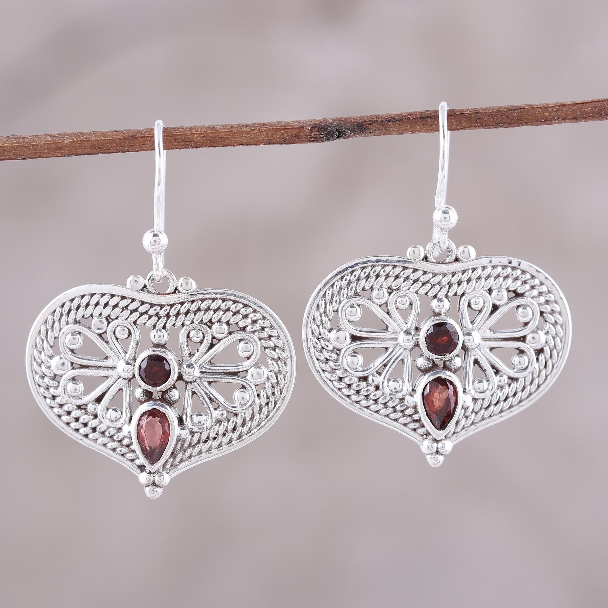 Handcrafted rope and flower motifs swirl within each of these lovely dangle earrings. Two glittering garnets add a pop of red to the polished sheen of sterling silver. Indian artisan Parul designs the heart-shaped earrings, selecting gemstones totaling 1.9 carats.