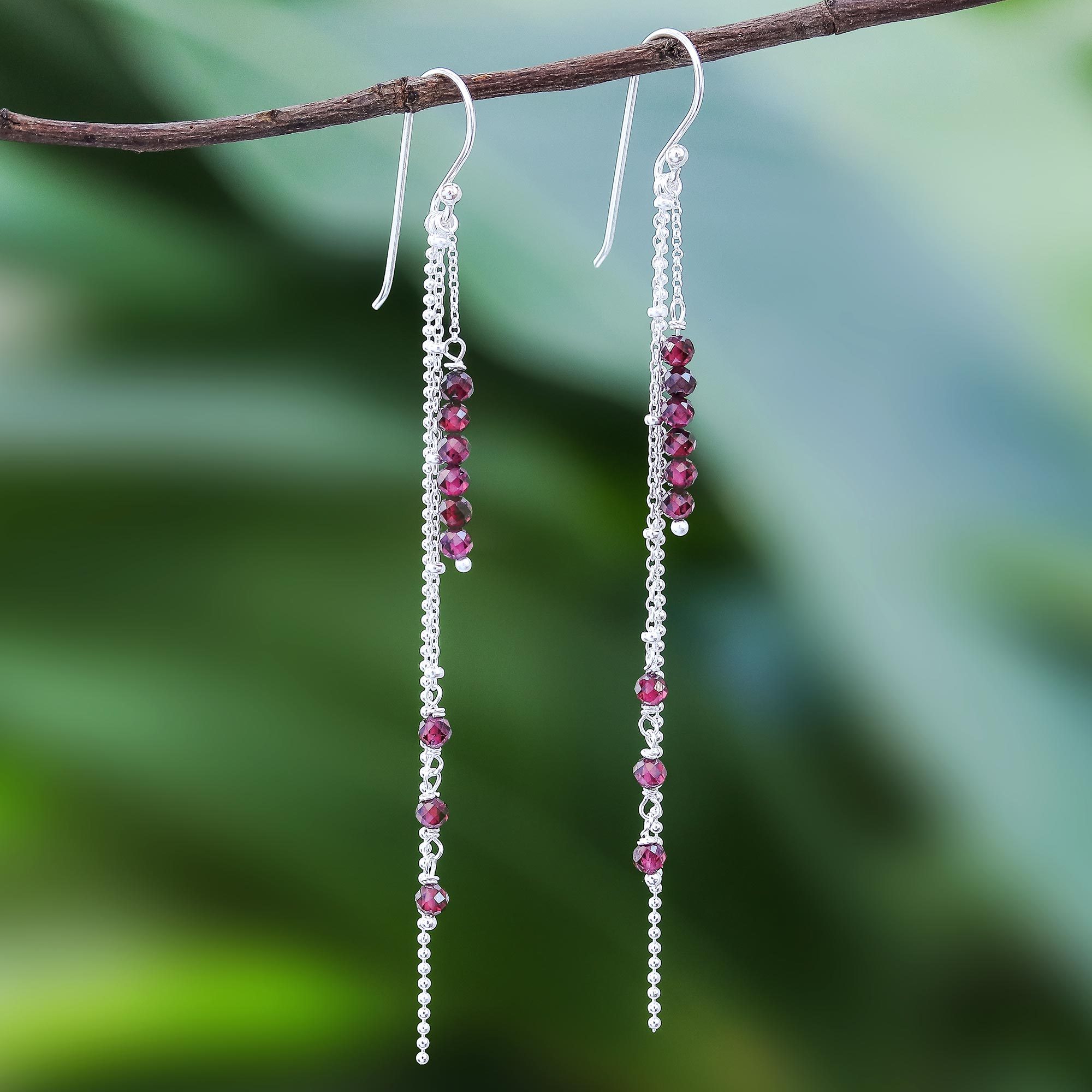 Like morning rain, beads of faceted garnet total three carats. Thai artisan Somsiri Juntamin creates this pair of long dangle earrings, which is made up of links and petite chains of sterling silver.