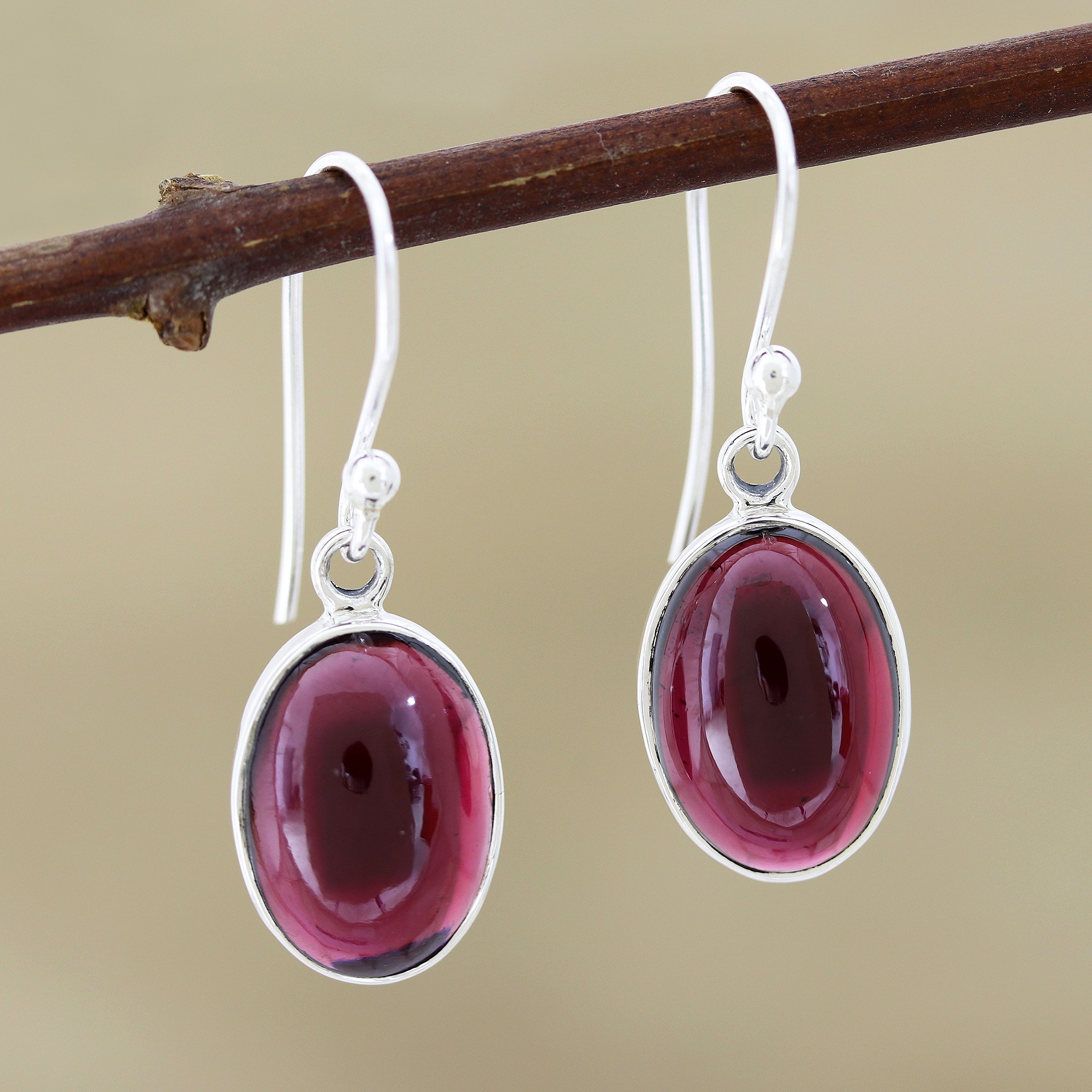 Garnet Cabochon Dangle Earrings, 'Oval Embers'