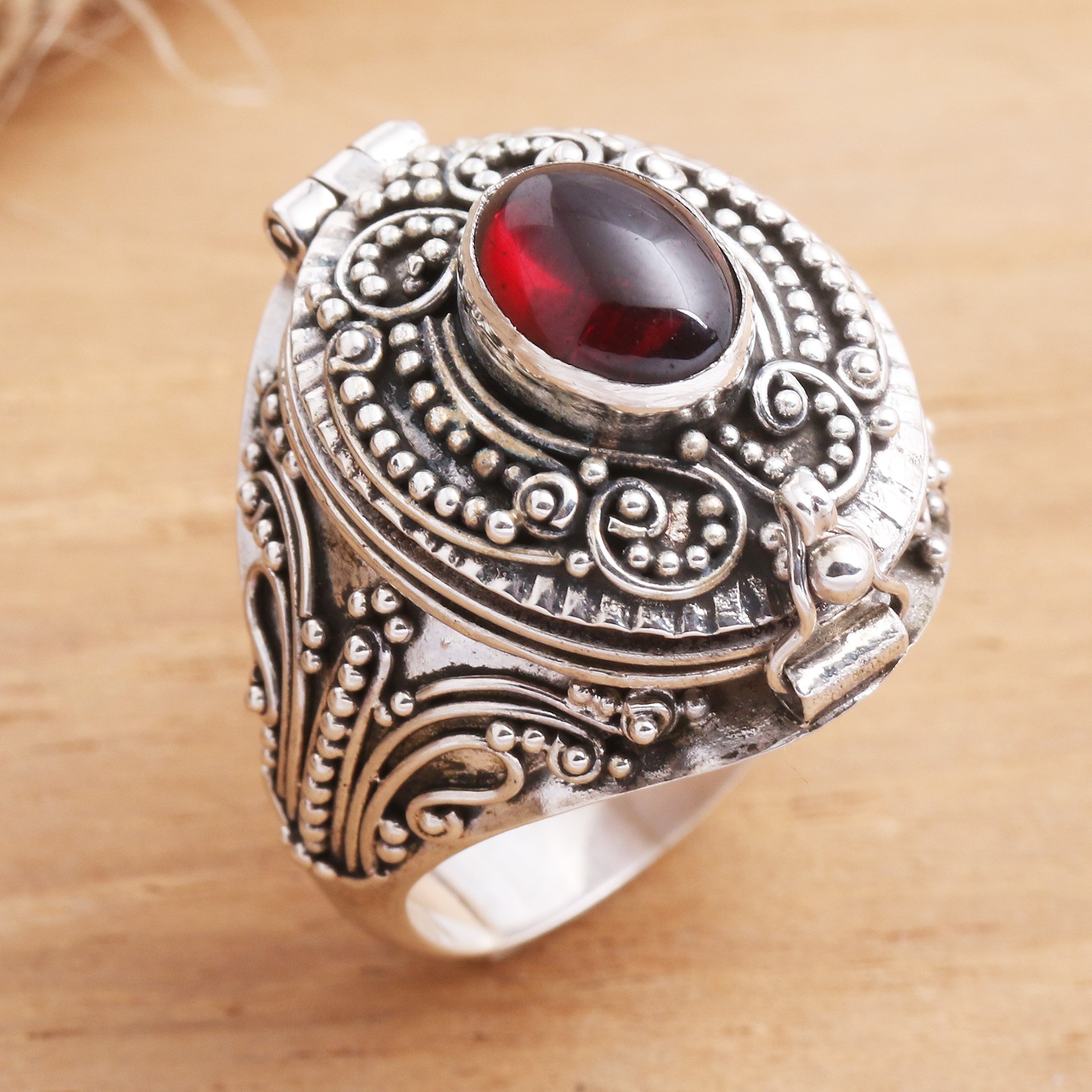 This stunning ring has a secret. Presented by Sukartini, the sterling silver ring features traditional Balinese details such as swirls and jawan, or silver granules. The crown features a bezel-set natural garnet cabochon, beneath which the magic happens. Open the tiny clasp to reveal a secret inner compartment, which harkens back to sixteenth-century Europe.
